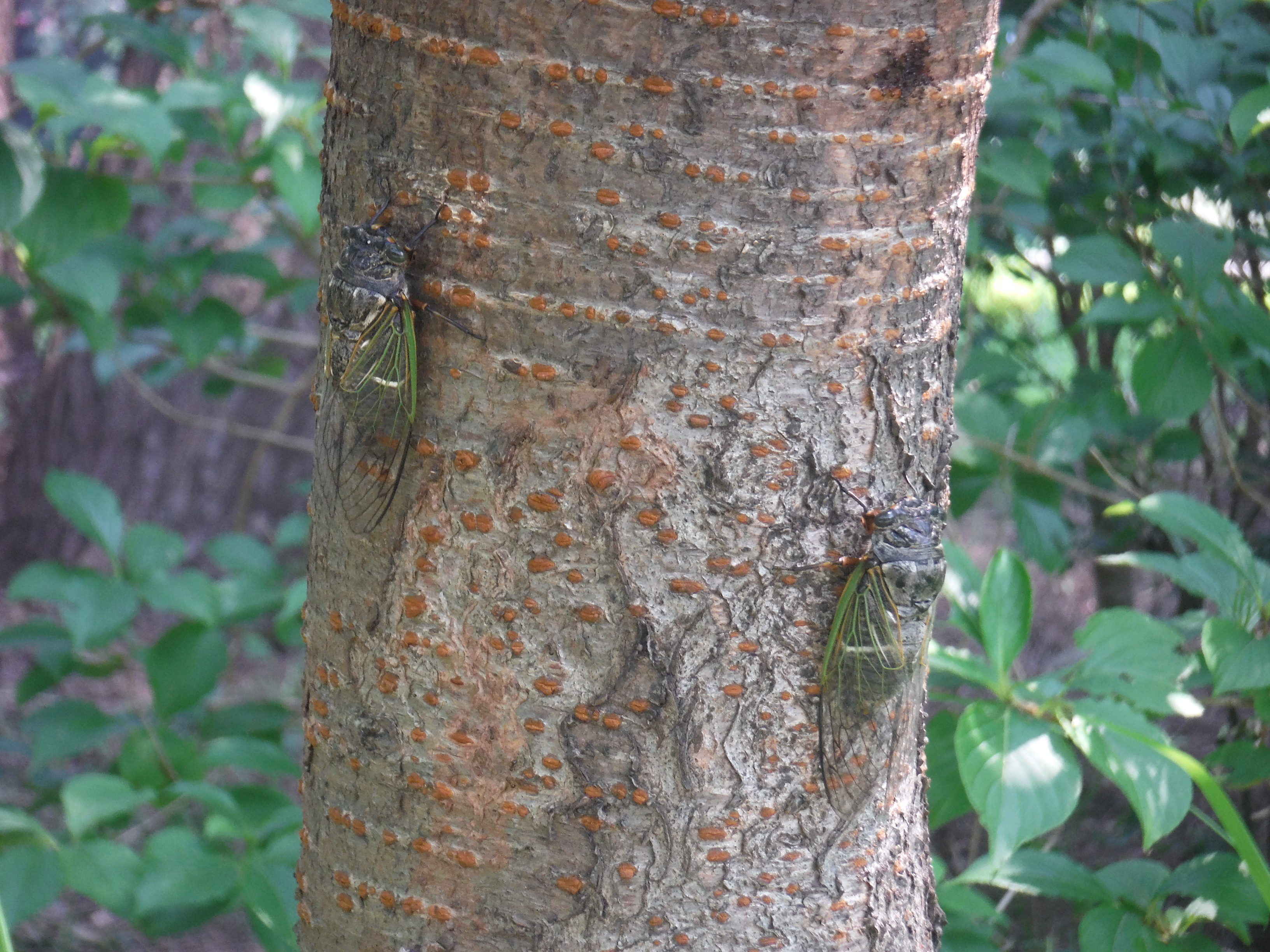 <1本の木にたくさんのセミがとまっています(クマゼミ)。この木には5匹とまっていましたよ!>