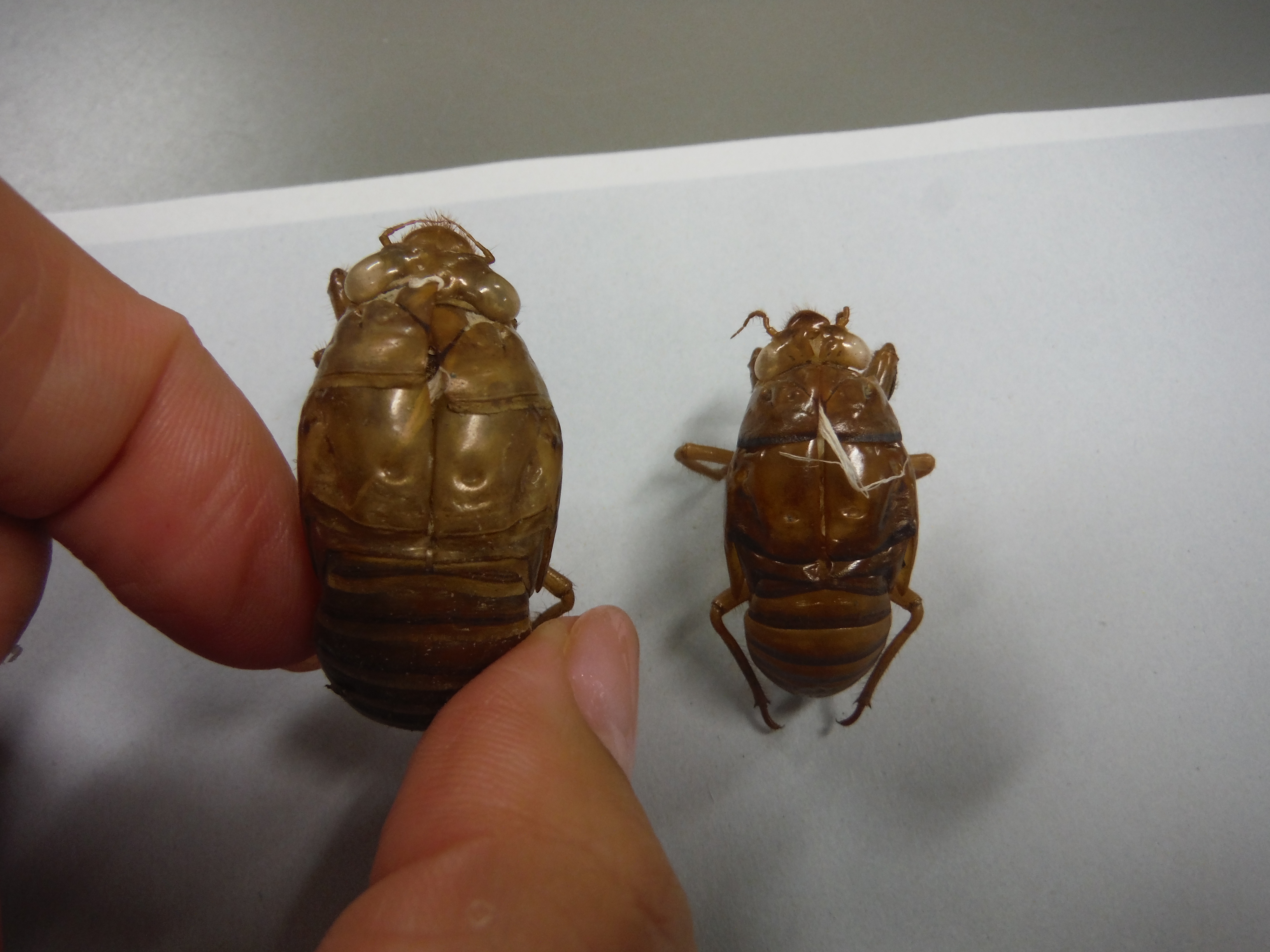 <抜け殻もよく見ると種類が違います、多分、左クマゼミと右アブラゼミ>
