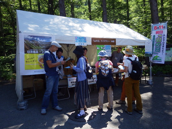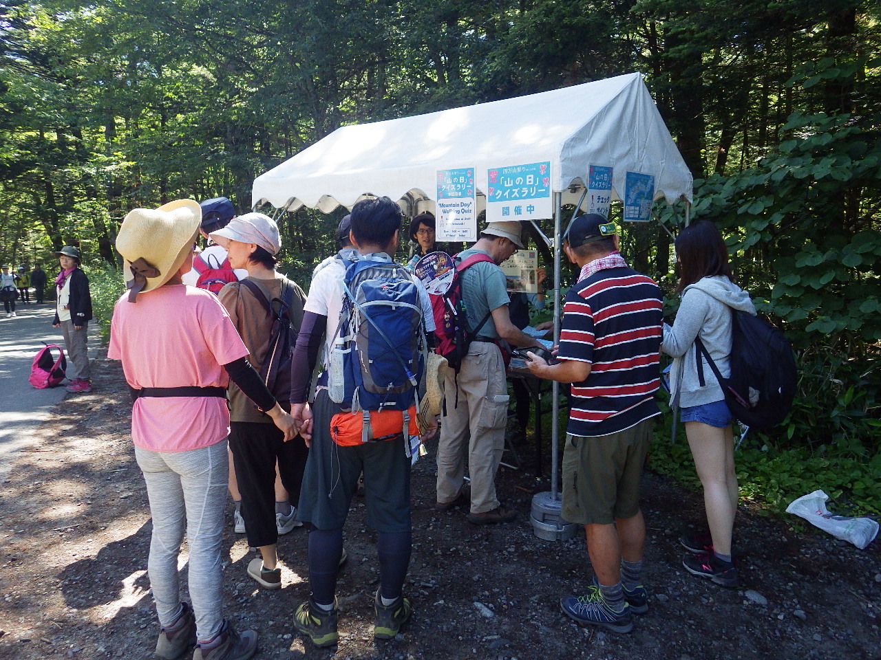 クイズラリーの問題は、初めて上高地を来られる方には少し難しいかもしれません。でも大丈夫!チェックポイントにいるボランティアさんが優しくヒントを出してくれます。クイズラリーに参加してくださった皆さんが、少しでも上高地や国立公園のことを覚えておうちに帰っていただければ幸いです。声かけをしている中で、今日が『山の日』だということを知らなかったお客さんもいらっしゃったので、ぜひ8月11日『山の日』のことも覚えてくださいね。