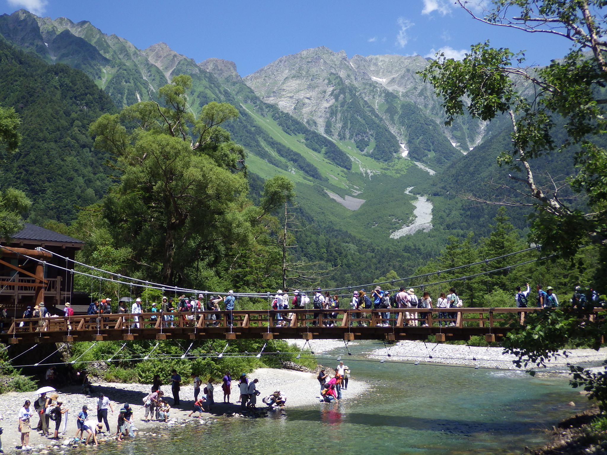 夏休み期間の上高地はたくさんの人で賑わっています。今年は特に8月上旬に晴れた日が続いたので、美しい河童橋からの景色をみなさんも満喫されたのではないでしょうか。