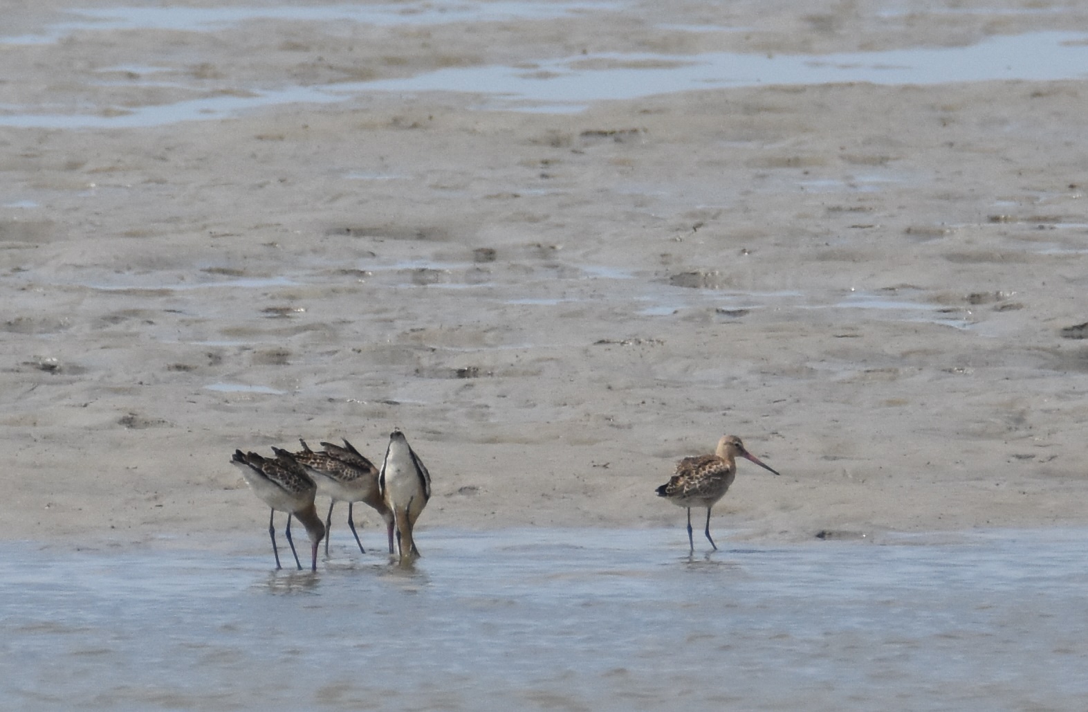 <中州にオグロシギ4羽が飛来。ちょっと遠いのですが、スコープではキレイに観察できました!>