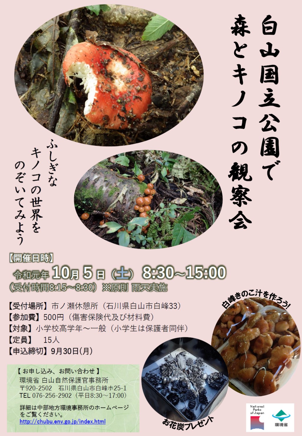 締切りは9月30日(月)です! 申込み方法やお問合せ先など、詳細は中部地方環境事務所の下記ページをご覧ください。 ↓↓↓↓↓ 白山国立公園自然観察会「白山国立公園で森とキノコの観察会」の開催について(お知らせ) 皆さまのご参加、お待ちしております♪