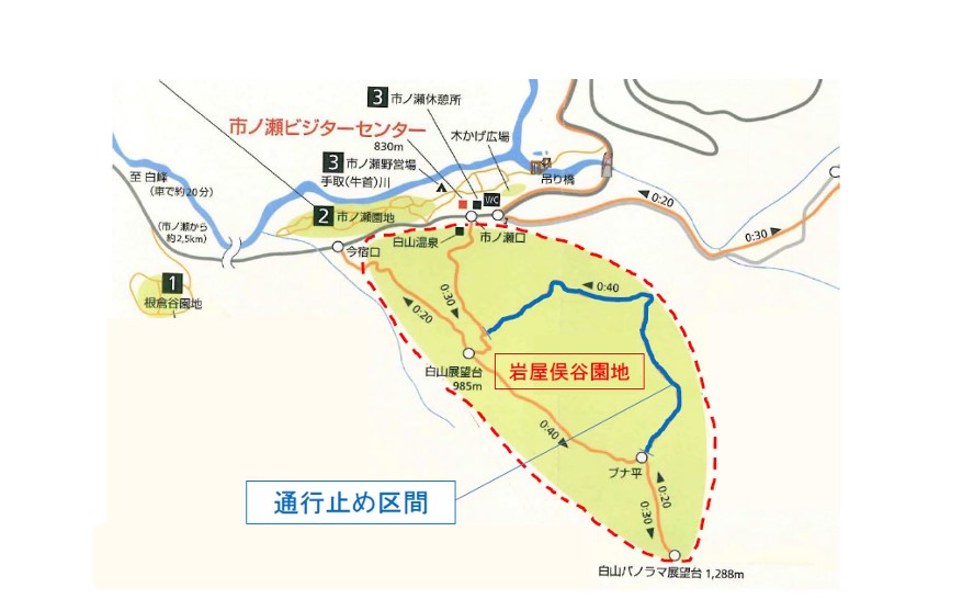 これから紅葉シーズンを迎える中で一部区間が通行止めとなり、ご迷惑をおかけしますが、皆さまのご理解とご協力をよろしくお願いいたします。 なお、岩屋俣谷園地のこの他の区間は通行できます。 ブナ林が美しい「ブナ平」や白山の眺望が素晴らしい「パノラマ展望台」に登ることはできますので、よろしければお越しください。 **** クマ注意情報 ******************** 市ノ瀬周辺はツキノワグマの生息域です。 今年も多くの目撃情報があります。(私も今年は何度も見ています。) 単独での行動、朝夕の行動は避け、音の鳴る者を携帯してください。 ********************************