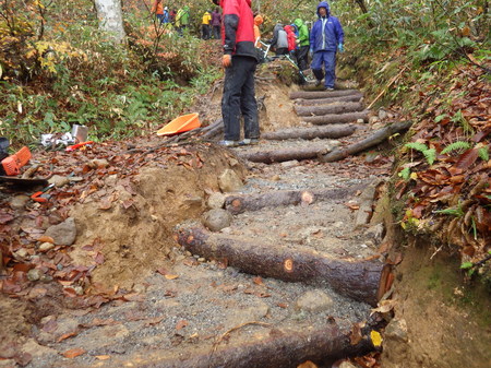 登山者の足運びまで計算し、施工してくださいましたが、歩きやすくすることが目的ではなく、登山者が歩きにくければ、それを除け新たな浸食が起きることがあるからです。