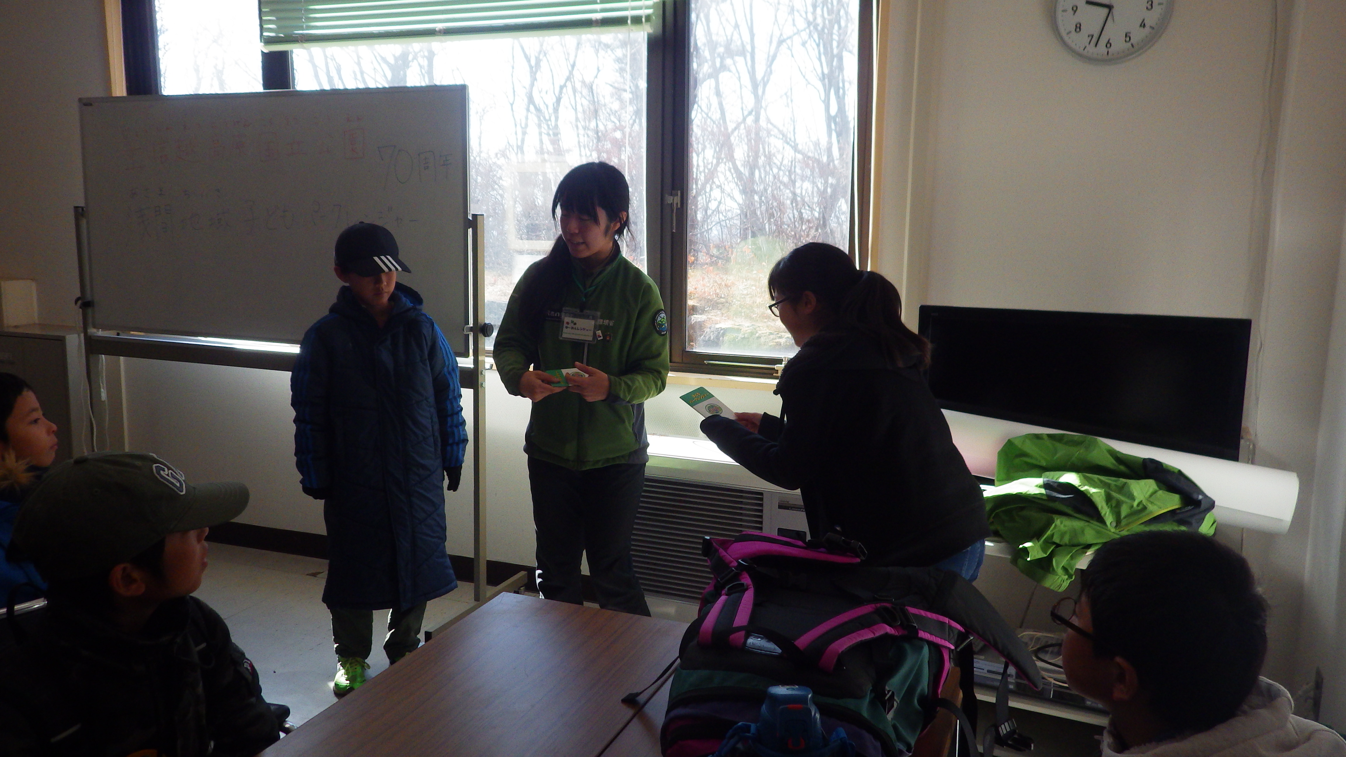 最初に環境省の万座自然保護官からレンジャーの仕事や国立公園についての説明を受け、子どもパークレンジャーとしての任命式が無事に執り行われました。