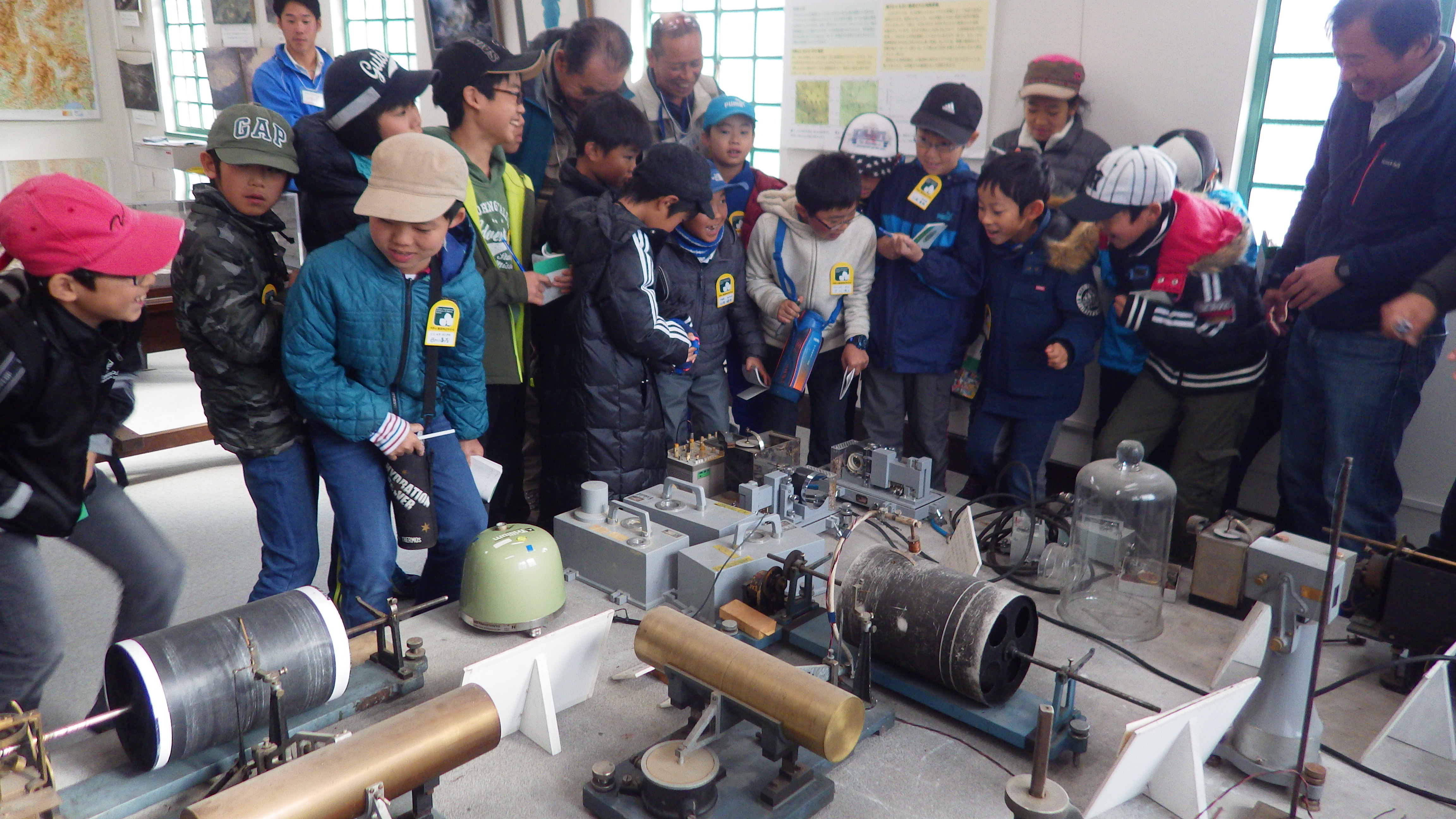 いろいろな噴石、巨大な火口の写真、歴代の火山観測機器、軽石が降り積もっている地層など、浅間山に関する資料の説明に、子どもたちは熱心に聞き入っていました。