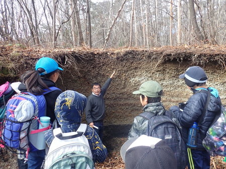 【観測機器や露頭の地層の説明に聞き入る子どもたち】