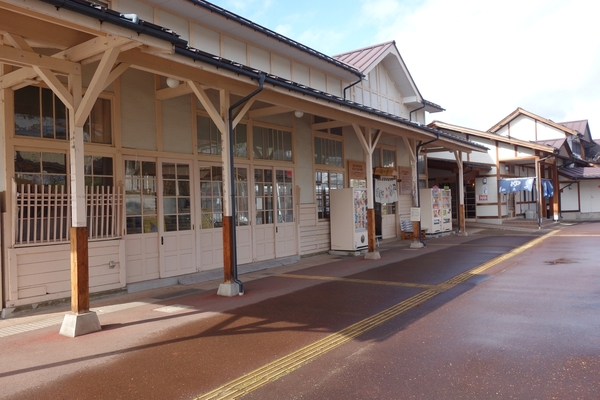 <写真展会場の「湯田中駅旧駅舎(楓の館)」の外観。会場の隣(右奥)に日帰り入浴施設があります。アフタースキーのお風呂のついでに写真展をご覧ください。>