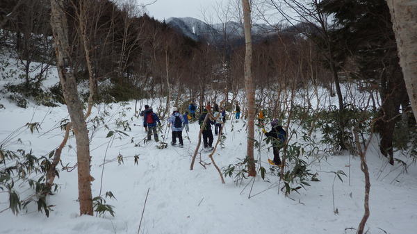 【笹や木道があらわになったスノーシューハイキングのコース】