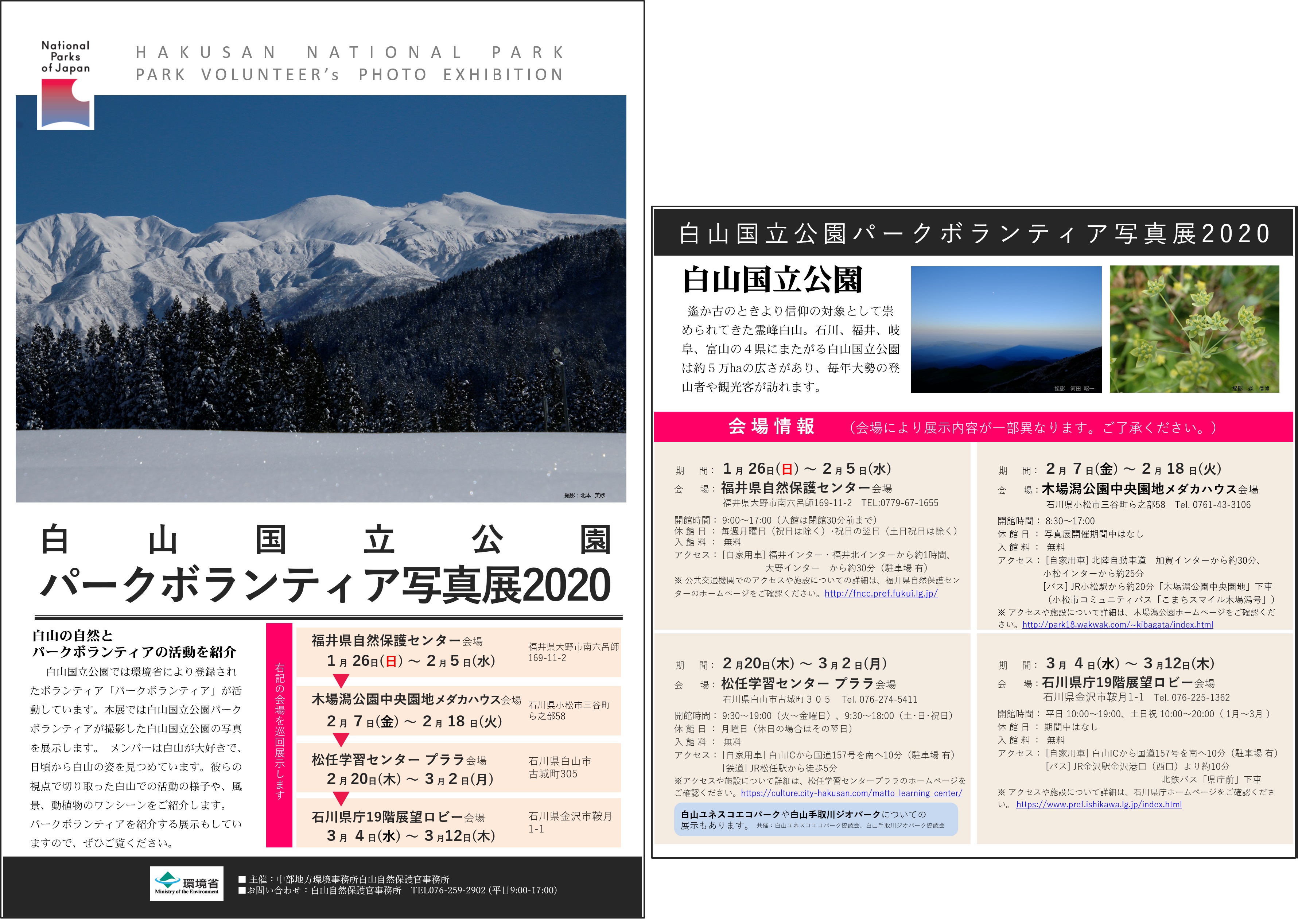 こんな状況ですが、今年も白山国立公園パークボランティア写真展を開催します。今年はまず、下記4箇所を巡回展示していきます! 【 福井県自然保護センター会場 】(←ただいま開催中!) 1月 26日(日) ~ 2月5日(水) ★冬はシジュウカラやエナガなど野鳥観察ができる「野鳥のレストラン」がオープンしています。 【 木場潟公園中央園地メダカハウス会場 】 2月 7日(金) ~ 2月 18 日(火) ★木場潟という水辺の公園で、木場潟公園からの白山の景色は最高です♪ お散歩やランニングで利用される方も多い、癒やしスポットです。 【 松任学習センター プララ会場 】 2月 20日(木) ~ 3月2日(月) ★松任駅からすぐの好立地です!図書館やコンサートホールがある文化施設です。 【 石川県庁19階展望ロビー会場 】 3月 4日(水) ~ 3月12日(木) ★石川県で最も高い建物の最上階での開催です。ここも白山の眺望が抜群! 隠れた観光名所です! 会場の場所など詳細は下記のチラシをご覧くださいませ。