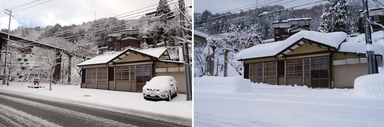 (左:1月31日の事務所前の様子、右:2017年12月15日の様子) 今朝は久しぶりに少し積もりましたが、2017年12月と比べるとかなり少ないことがわかります(屋根や右端の電信柱の埋もれ具合に注目!)。 あまりの雪の少なさにスキー場は営業できず、地域の方も白山の自然を心配しています。雪は生活の上では大変に感じることもありますが、もう少し積もってほしいものです。