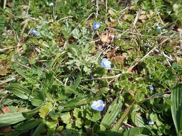 「オオイヌノフグリ」という花で、小さくとてもかわいい花です。花言葉は『信頼』『神聖』『清らか』『忠実』だそうです。道端や田んぼのあぜ道など、よく見るとあちらこちらに咲いています。