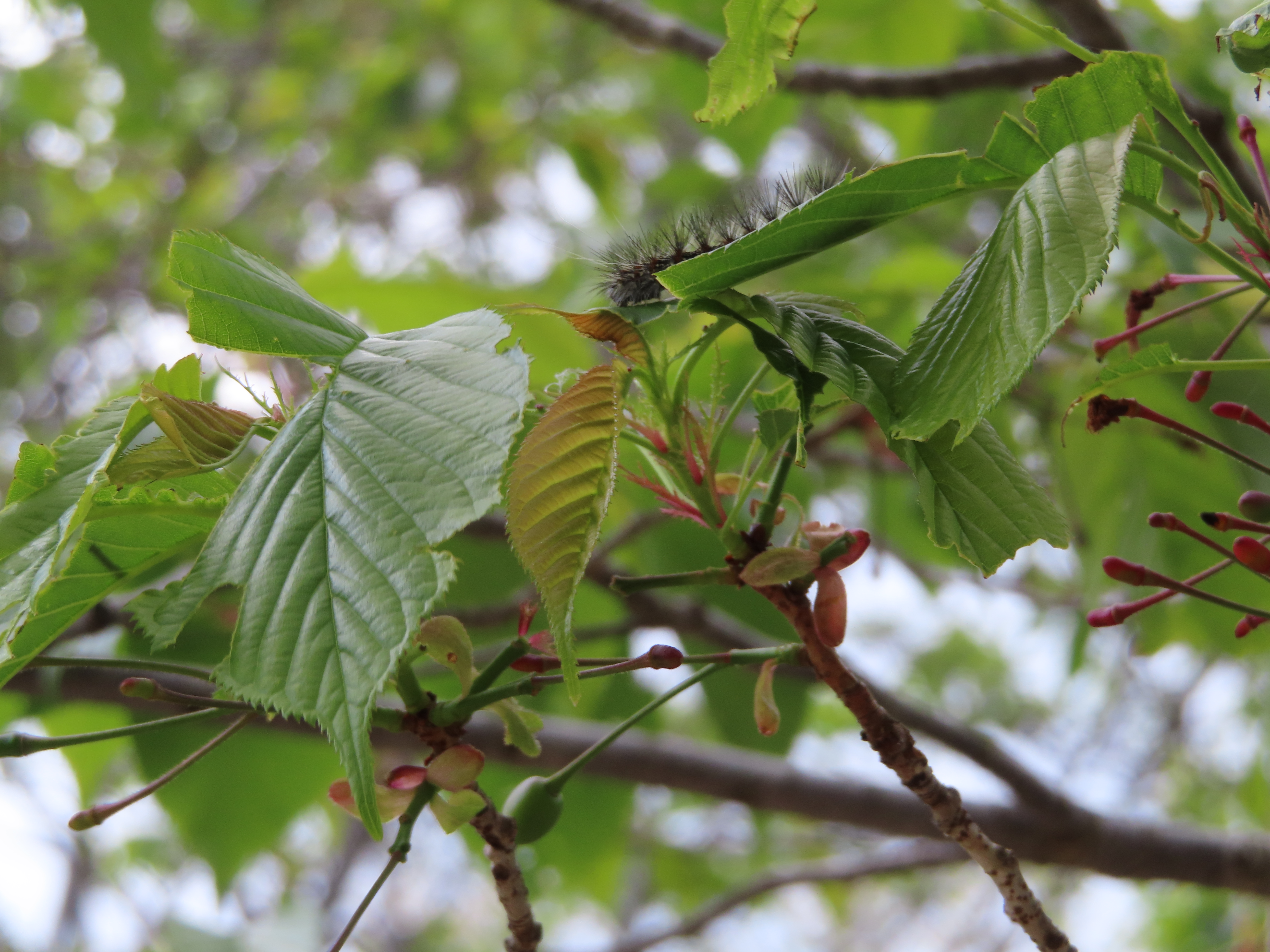 マイマイガの幼虫がいたるところにいます。(ソメイヨシノの写真にもいるのですよ。さがしてみてください。)毒針を持っていない毛虫だと教わりました。でも、中には毒のある毛虫がいたり、苦手な人もいたりするので、手すりなどにたくさんいるときは近くの木々に移動をお願いしています。(枯れ葉でそっとはらいのけます。)