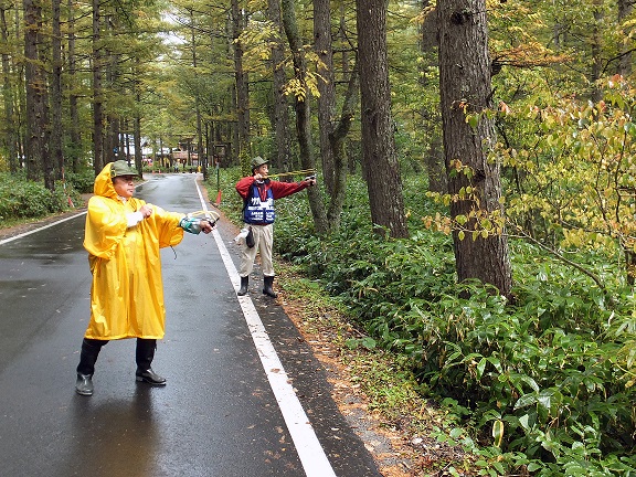巡視:テレメトリー(遠隔計測装置)によりサルの位置を確認する上高地自然公園財団職員
