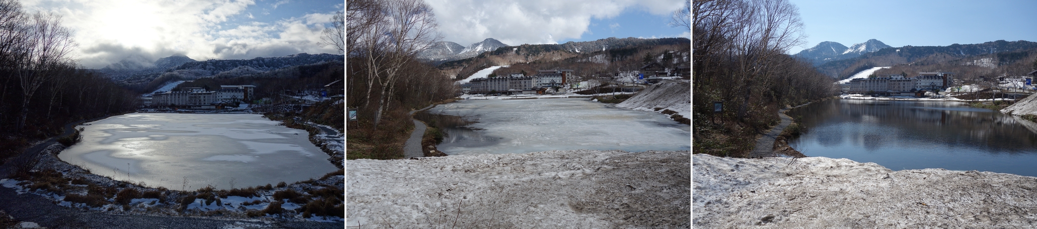4月になっても27日にはまだ大部分が氷に覆われていたのですが、30日には水面を覆っていた氷がすべて溶けて、水面全体が見えるようになりました。