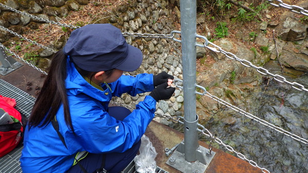 この橋の手すりとなっている鎖が欠けたりしていないか等チェックしつつ、劣化したカラビナを交換しました。