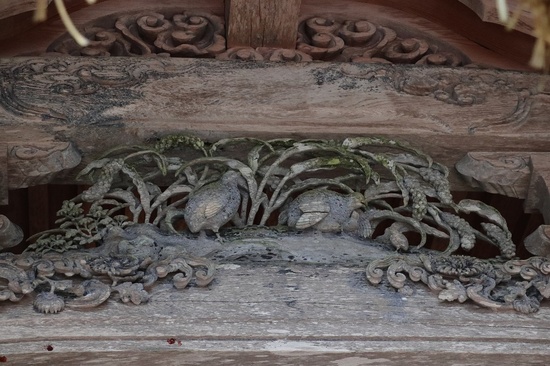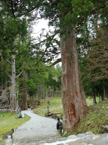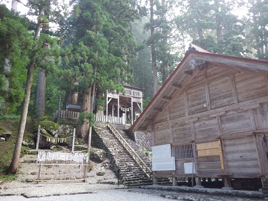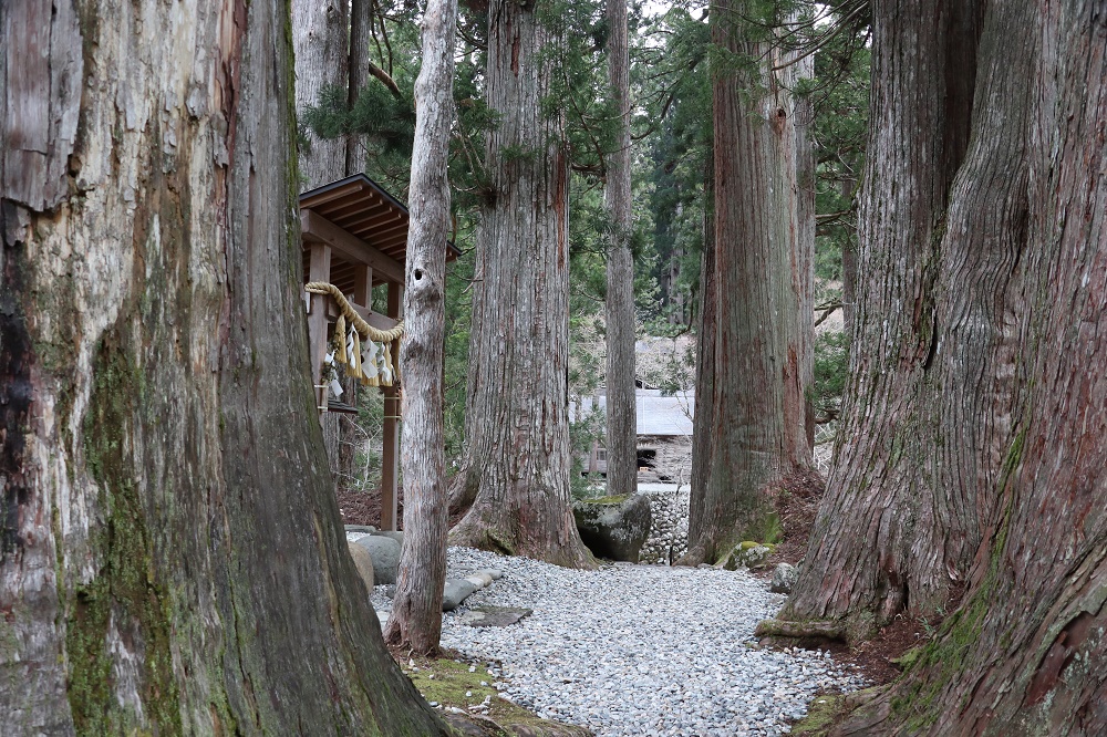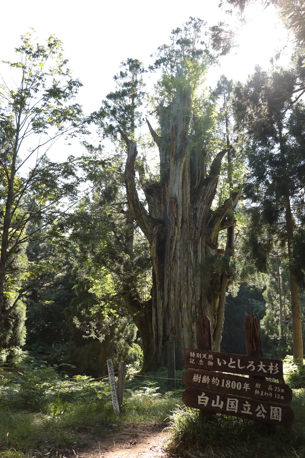 皆さん、こんにちは。 白山自然保護官事務所の大石です。 不要不急の外出自粛で、野外の潤いが足りずにしおれている人、いませんか!? おうちにいる皆さんに、野外の空気を少しでもお届けするために、アクティブ・レンジャー日記上で皆さんを白山国立公園の旅へご案内したいと思います。 今回は石徹白大杉に出会う旅です。 ところで、皆さん「石徹白」って読めますか? 答えは「いとしろ」です。 岐阜県と福井県の境にある地区の名前ですが難読ですよね。 私は最初、読めませんでした...。  (銚子ヶ峰という山の上から見た石徹白。写真中央付近。2015年7月に撮影されたもの) さあ、目的地域の読み方がわかったところで、出発しましょう! 【 おうち de 白山国立公園の旅! その2 樹齢1800年!神秘の大樹に出会う石徹白の旅(岐阜県郡上市)】 長良川沿いの国道158号から岐阜県道314号へ入り、棚田などが広がる山あいの集落をドライブです。阿弥陀ヶ滝の看板を横目に、山道を上って下ると再び集落が現れます。 石徹白地区です。 夏には美味しい美味しいとうもろこしが採れる地区です。 空がとても広く感じるのどかな地区をさらに奥へ進むと、風格のある鳥居が現れます。 ここは白山中居神社。  (白山中居神社の鳥居。2019年5月撮影) この神社は言い伝えによると、景行天皇12年(82年)の創祀とされています。今は2020年なので、1900年以上の歴史があるいうことになりますね。 ちょっと立ち寄りましょう。 まず、目に付くのは鳥居の傍にあるスギ。 鳥居が立派なので、写真だとたいしたことがないように見えますが、実は巨大です。 でも、驚くのはまだまだ早い。 境内に足を踏み入れると、神社の歴史を物語るように次から次へと巨樹が姿を現します。  (参道沿いの巨樹。2019年5月撮影) 参道を歩いている男性と比べてみると大きさがわかります。 遠近法は使っていません。念のため。  (参道には巨樹がひしめき合っています。2019年5月撮影) 林立する巨樹によるものなのか、境内には重厚というか荘厳というか...心が静まる不思議な空気があるように私は感じます。 ちなみに境内にそびえるスギの巨樹は140本ほどあり、樹齢は200~1000年以上だそうです。岐阜県の天然記念物「白山中居神社の森」に指定されています。 駐車場からすぐにアクセスできて、これほどたくさんの巨木の中にたたずむことができるなんて幸せです。 ところで、白山中居神社の見どころはスギだけではありません。 本殿にもおすすめがあります。  (拝殿の奥にある本殿。左奥の建物。2013年に撮影されたもの) 本殿には様々な彫刻が施されているのですが、どれも見事なんです! 獅子の彫刻などは人が見ていないときにはこっそり動き出してるんじゃないかと想像してしまうくらいに躍動感があります。 その中でも、私のお気に入りの彫刻をご紹介しましょう。 こちらです!  (粟穂に鶉。よく見ると足元にはヒナもいます♪2019年撮影) なんとウズラ家族です!丸っこい形がかわいい! 本殿の正面にあるこちらの「粟に鶉(うずら)」の彫刻は、県の重要文化財に指定されています。神社などは厳めしい彫り物が多いと思っていたので、私はこの出会いにほっこり癒されました♪ さらに、社殿の裏山に続く散策道をちょっと登ると「浄安杉(じょうあんすぎ)」という樹齢約1200年のスギの巨木もありますよ。 失礼がないように きちんとお参りしたら、本日の目玉に向かいましょう! 車に乗って、白山中居神社から道幅の狭い道を約7km走ると、目的の場所への入口に到着です。  (入口。2017年7月撮影) 「19km」という、引いてしまいそうな数字が見えますが、ご安心ください。 これは白山までの距離。 本日の目的地へは340mです! ここからは徒歩。 駐車場に車を止めたら、よく整備された石段を上ります。 そう、石段。  (下りの余裕があるときに撮った石段。2019年7月撮影) 気持ちのよい木立の中を行く石段ですが、運動不足の身に堪えることは間違いないと思われます。不要不急の外出は自粛中であっても、体力をなるべく落とさない工夫はやはり忘れてはいけませんね。(自分への戒めを大いに含みます) 石段を上りきると...  (石徹白大杉。2018年7月撮影) ついに到着です。 推定樹齢1800年。 周囲約13m。 国の特別天然記念物「石徹白のスギ」です。 石徹白大杉と呼ばれていますが、大人12人が手をつないでやっと一周できるということで「十二抱えの大杉」とも言われます。白山を開山したという泰澄大師が刺した杖が育ったという伝説もあるそうですよ。 天に向かって力強く伸ばされた枝、他のスギとは違った白っぽい樹皮を持つ姿は威風堂々としていますね。また、大杉の上には、たくさんの異なる種類の木々が育っているのですが、巨樹の上に森ができているようにも見えて、神秘的です。 大樹がまとう空気を胸いっぱいに吸い込んでリフレッシュしたら、帰ることにしましょうか。 お疲れ様でした。 本日の旅はいかがでしたか? 皆さんに少しは野外の潤いは届いたでし