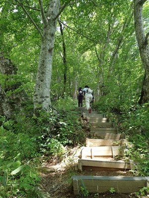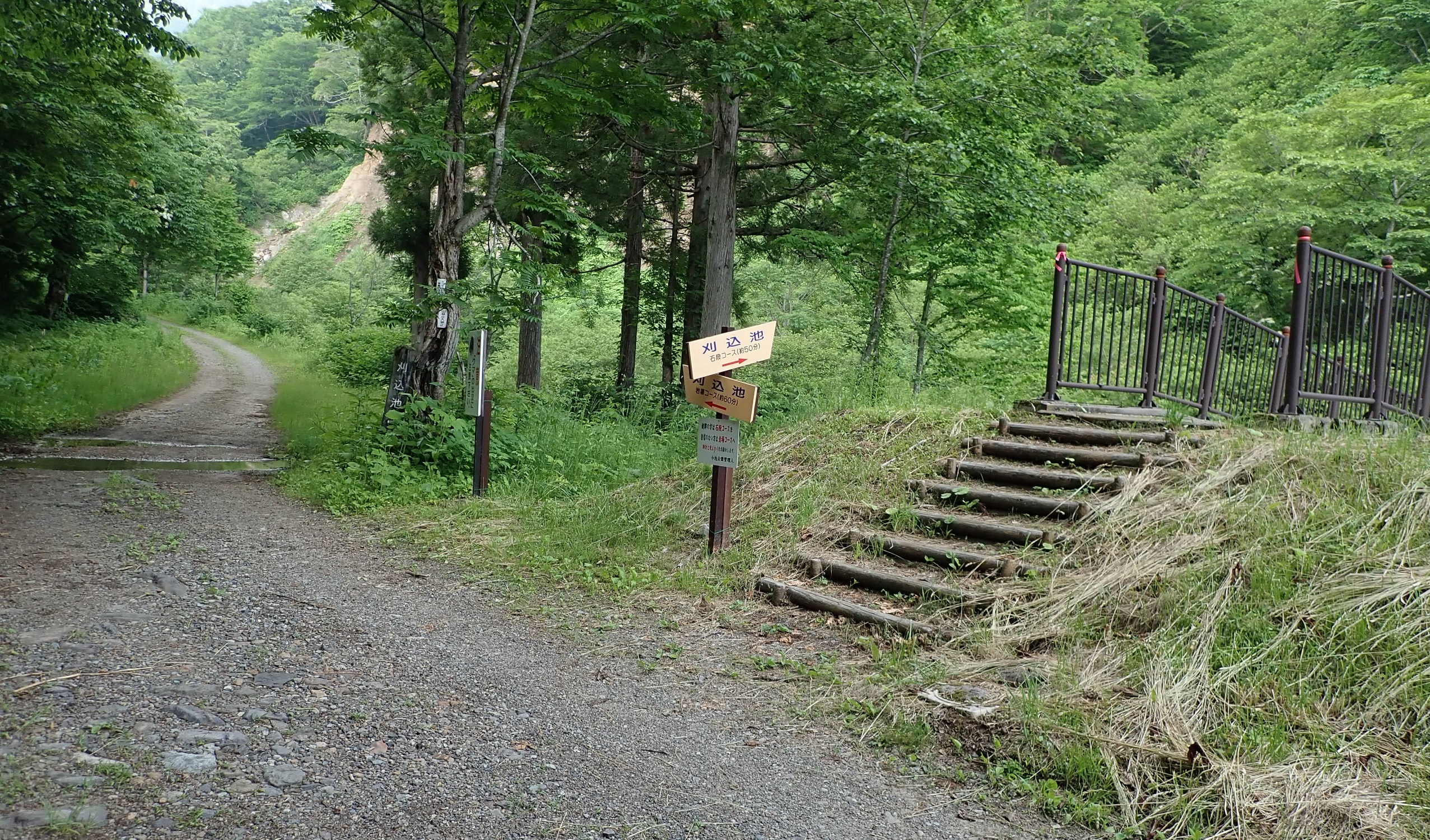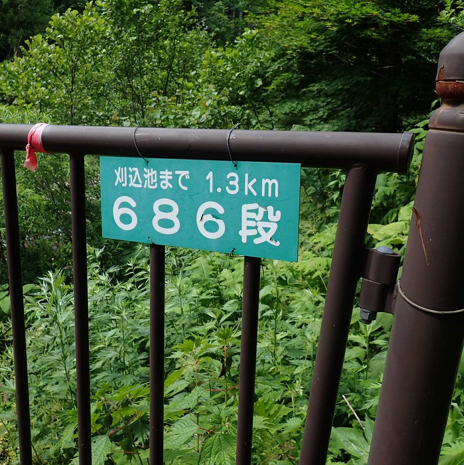 歩き始めてすぐ・・・  (クリの巨木) 大きな栗の木に出会います!木の下には成人男性が一人いますが、わかりますか?木が巨大過ぎて小さく見えます!! さらに進むと分岐に到着。 どちらを選んでも刈込池に行ける周回コース。右は石段コース。左は岩場コース。どちら周りかで大変さが異なります。あえて今回は「健脚向き」の石段コースを選んでみましょう。 しかし、橋を渡ると不穏な表示が・・・・。  (左:分岐、右:686段・・・不穏な表示) 刈込池まで本当に686段かどうか、途中で数が分からなくなりましたが、段はたくさんあります・・・。  (果てしなく続くように見える階段) ここだけの話、コース上には自然を紹介する解説板が何か所も設置されているので、それを読むという口実でゆっくり休憩がしやすいです。勉強にもなるし、一石二鳥! でも、外出自粛が解除されたとき、刈込池に行きたいと思っているそこのあなた!家の中での筋トレをおろそかにしてはいけません。油断せずに鍛えましょう。 階段を上り続けた後、ご褒美のようなブナの巨木の間を気持ちよく進むと、刈込池に到着です! 初夏の刈込池の水面に緑が映り込む様子はとても神秘的で、まるで東山魁夷の絵画「白い馬の見える風景」のよう・・・。