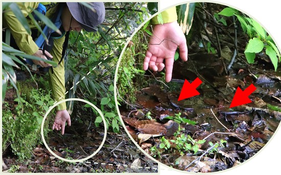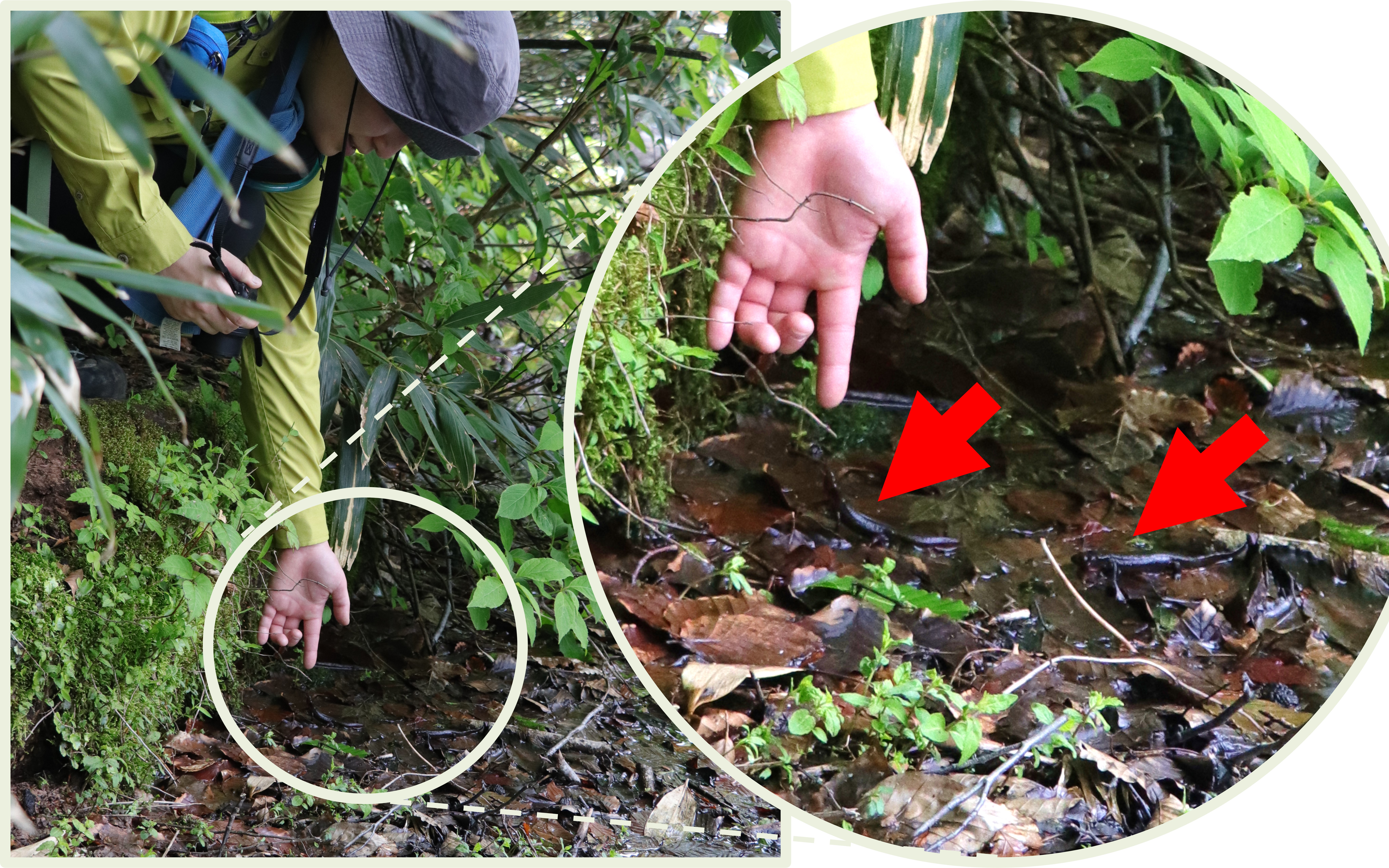 (左:モリアオガエルのカップル、右:あっちにもこっちにも卵!卵!卵!) そして、池の中をのぞけば、そこにはアカハライモリが・・・意外とたくさんいます。手を差しのばすと、アカハライモリが寄ってきてしまう人も中にはいるようです。  (催眠術にかかったかのように集まってくるイモリたち(赤矢印)) イモリやカエルたち両生類のパラダイスである刈込池ですが、実はヘビに関する伝説があります。 ~ むかしむかし、今から1,300年以上も昔、白山には大蛇が3,000匹もいたそうな。蛇たちは暴れ回って山麓の人を困らせておった。そこで、白山を開山したことで有名な泰澄大師という人が法力で3,000匹のヘビを封じ込めた。~ 何とこのうち1,000匹が刈込池に封じられているそうです。 刈込池から見える三ノ峰の中腹に剣ヶ岩という巨大な岩がありますが、泰澄大師がここに大剣を突き立て、剣の影が池に映るようにしたところ、蛇たちは剣が怖くて出てこられなくなったんだとか・・・。 大蛇が1,000匹も出てきたら大変なことになりそうですから、これからもしっかり封じられているといいですね。 刈込池を堪能したら、ブナの巨木の森を楽しみながら駐車場へ戻ります。  (ブナの巨木の間を歩く)