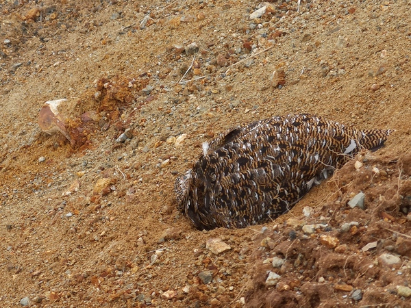 カラスや上空を飛んでいた猛禽類を恐れてか、歩道の近くの砂地にいたライチョウを見ていたら近寄ってきてくれました。