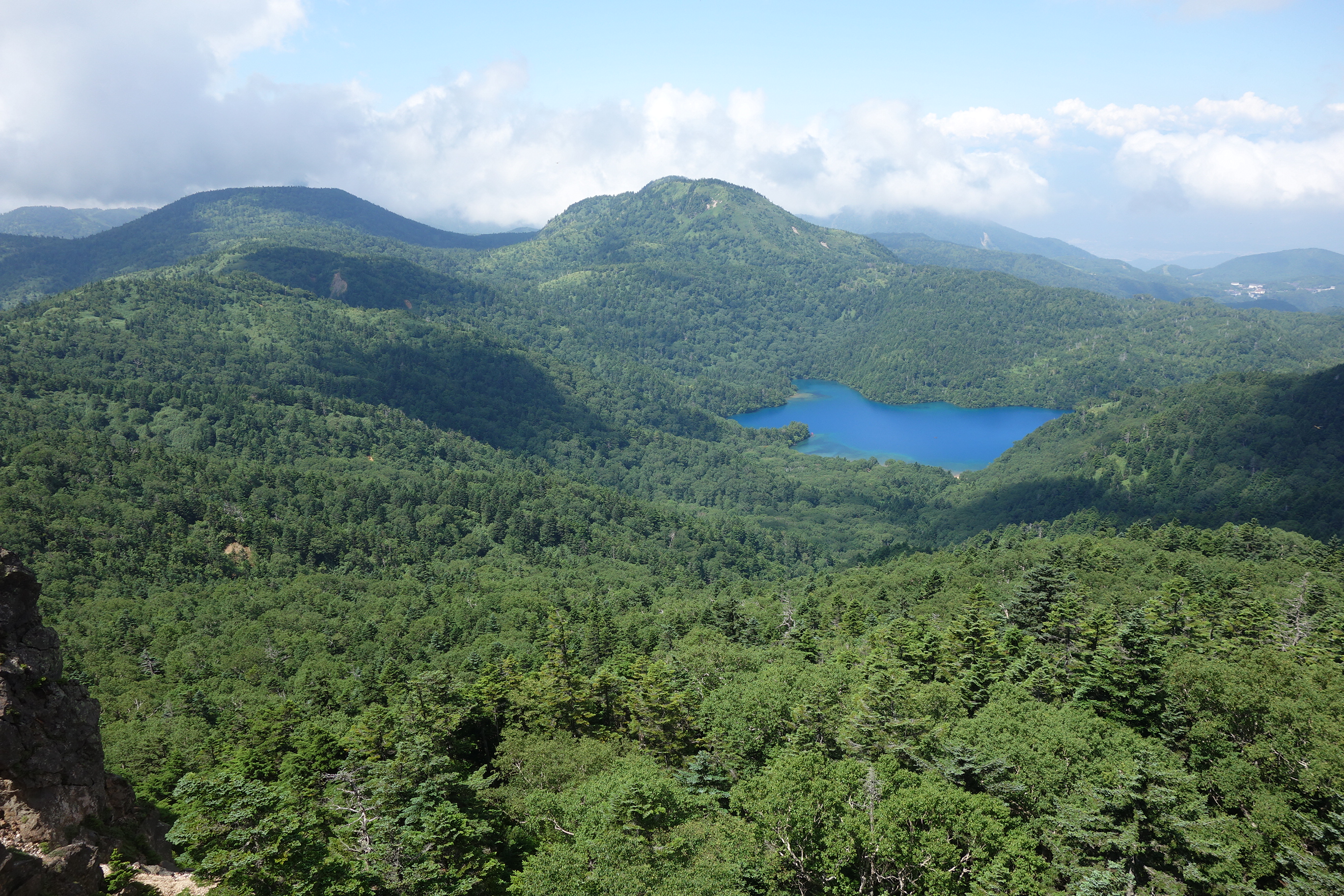 <赤石山山頂から。中央の志賀山の溶岩で堰き止められてできた池。青色の水面が印象的です。写真の右奥が中野市方面。平成28年8月8日撮影。>