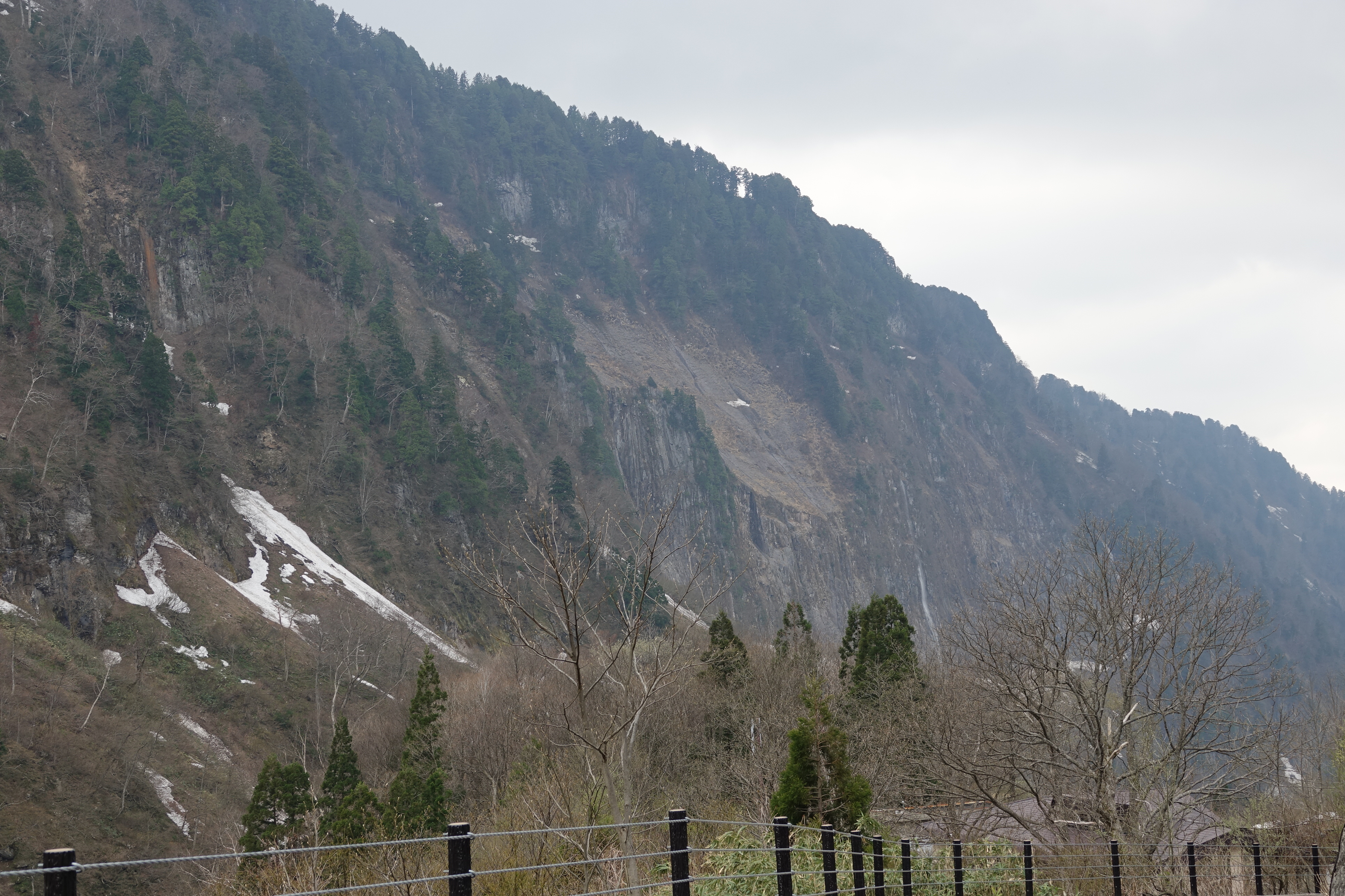 称名滝の下流部を見上げると、通称「悪城の壁」と呼ばれる岩壁がそびえ立っています。その高さは500mあり、一枚岩となっています。