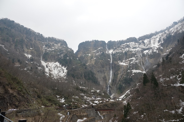 <展望台から称名滝(左)、ハンノキ滝(右)を見上げる>