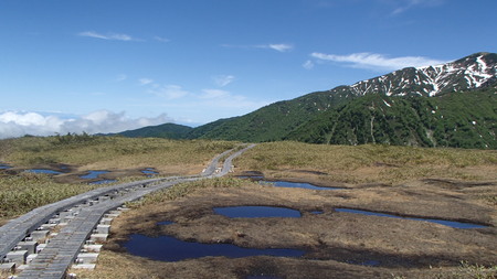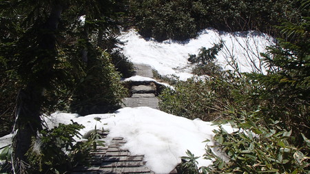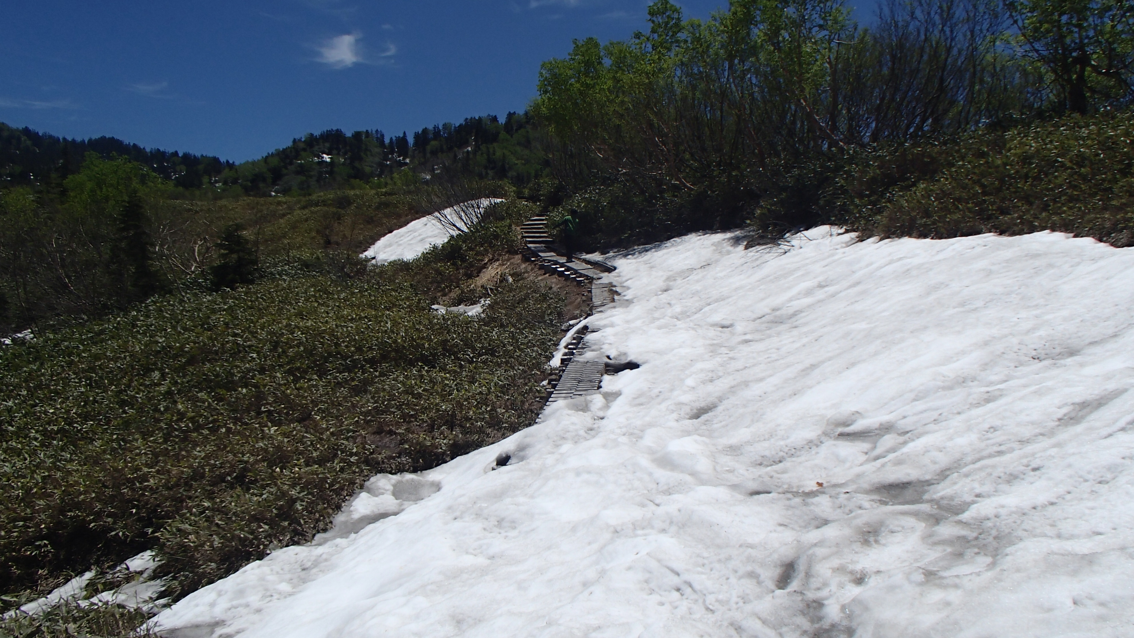 木道上は雪がないところがほとんどですが、地図の青で囲った南側はグズグズした雪が残っておりますので足元に充分お気をつけください。