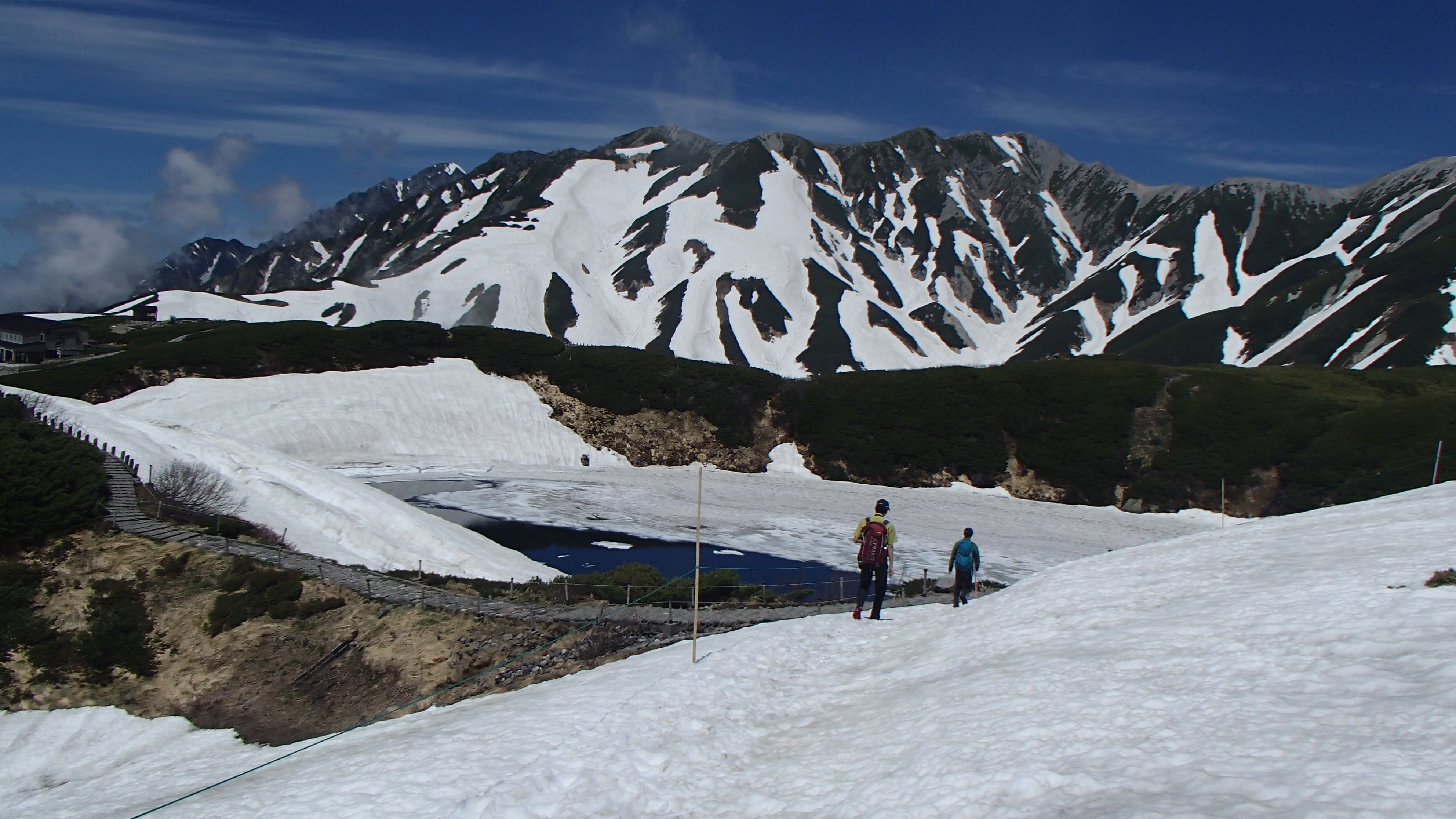 室堂平周辺の歩道上は雪解けが進みましたが、ところどころ雪がありますのでスニーカーより防水の登山靴や長靴の方が安心です。