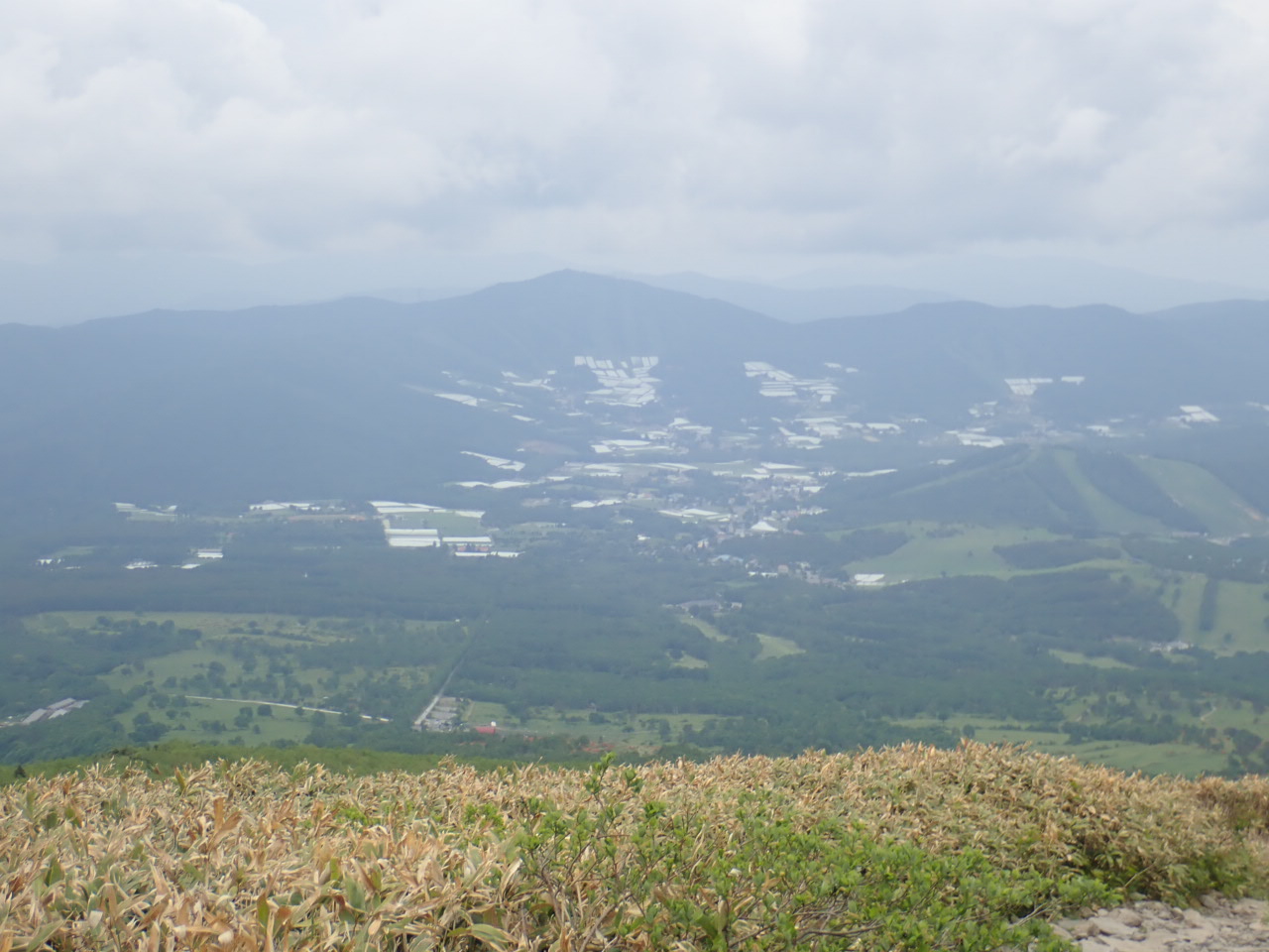 ⇑根子岳山頂からの菅平高原の景色。この日はあいにくの曇りです。