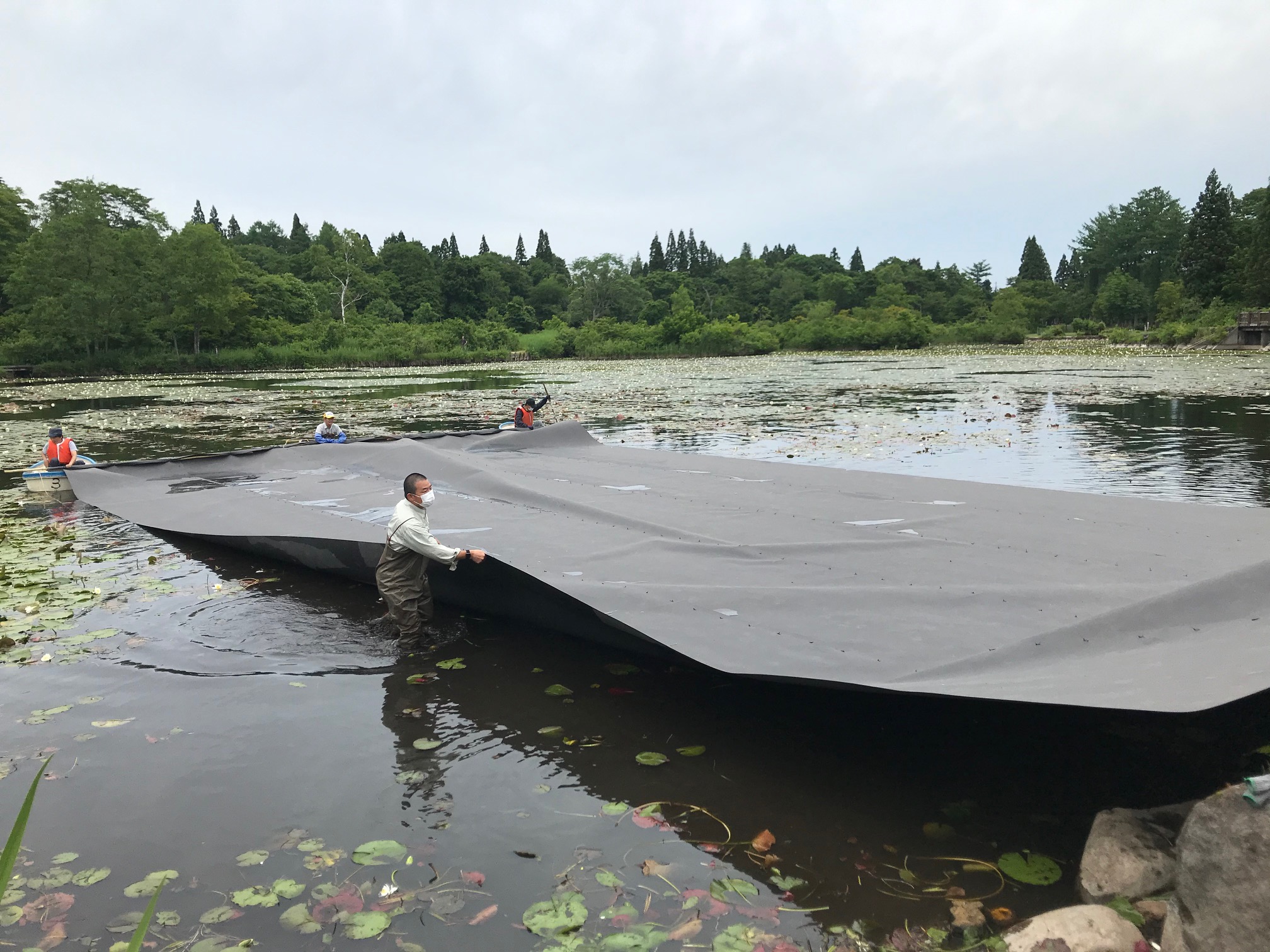 このシートを設置することにより、成長に必要な太陽光を遮り、2~3年でスイレンを根から枯らす