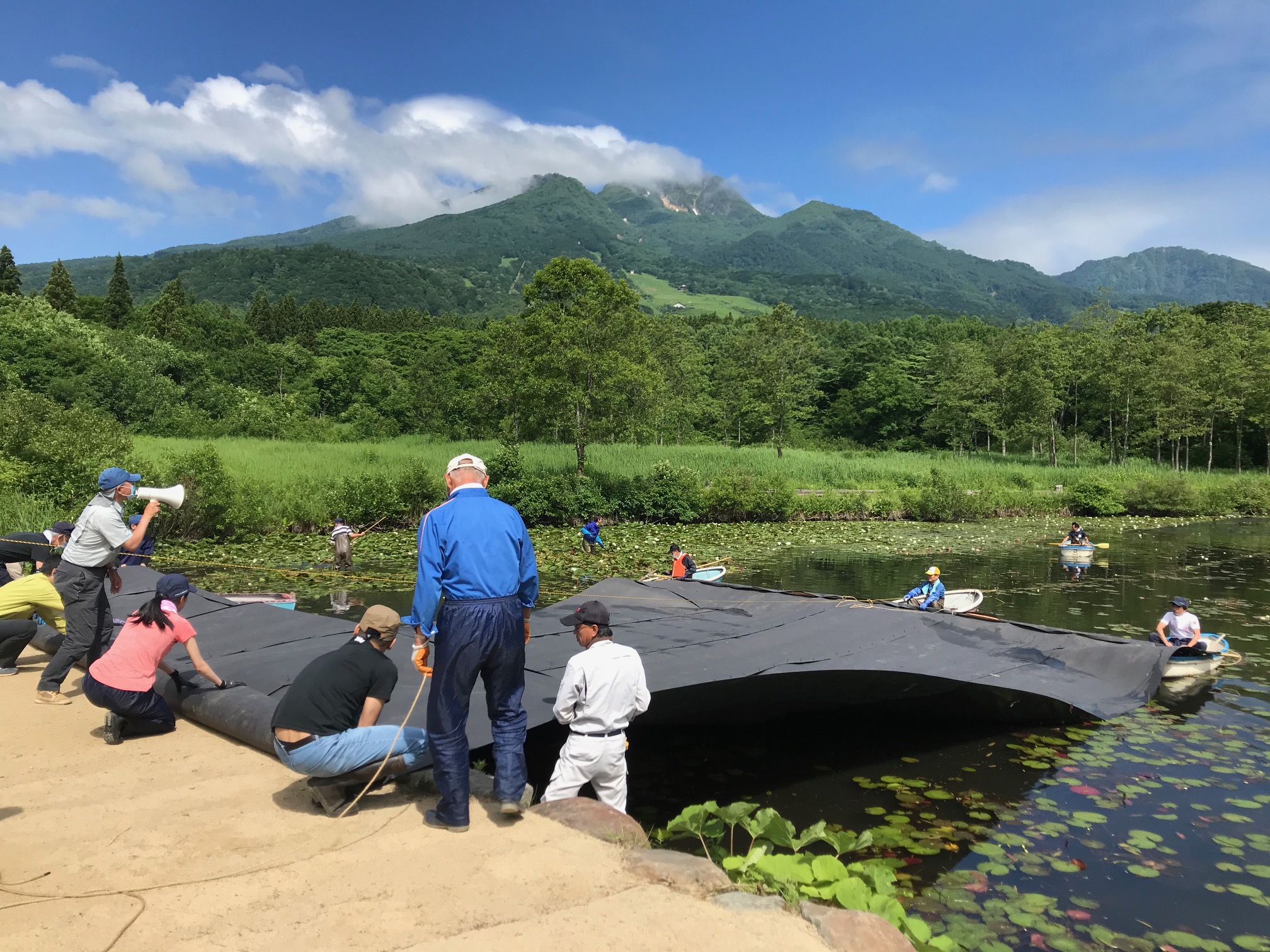 6/2224、いもり池での外来スイレン駆除を目的に、妙高市事業で遮光シートを設置しました。