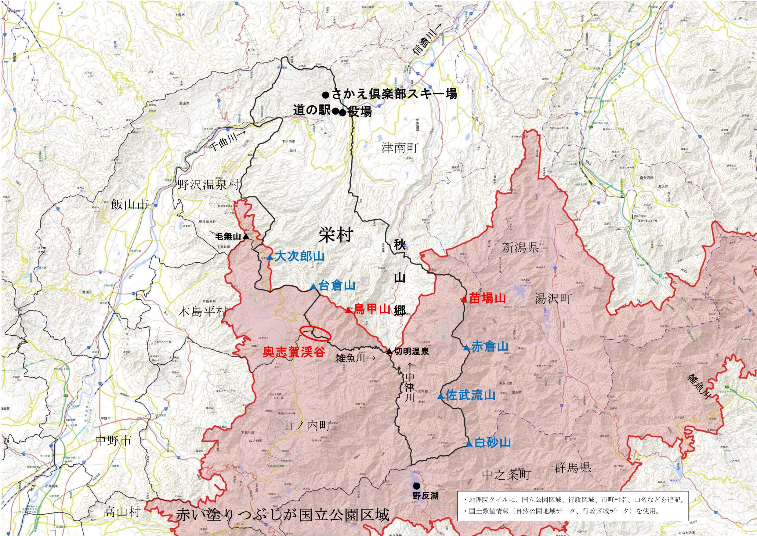 栄村と国立公園区域の図です。栄村の国立公園は次の3つの区域に分かれています。