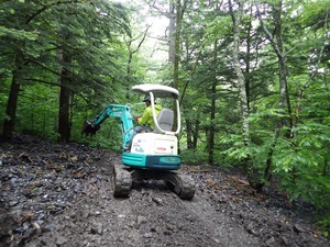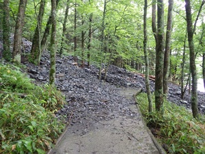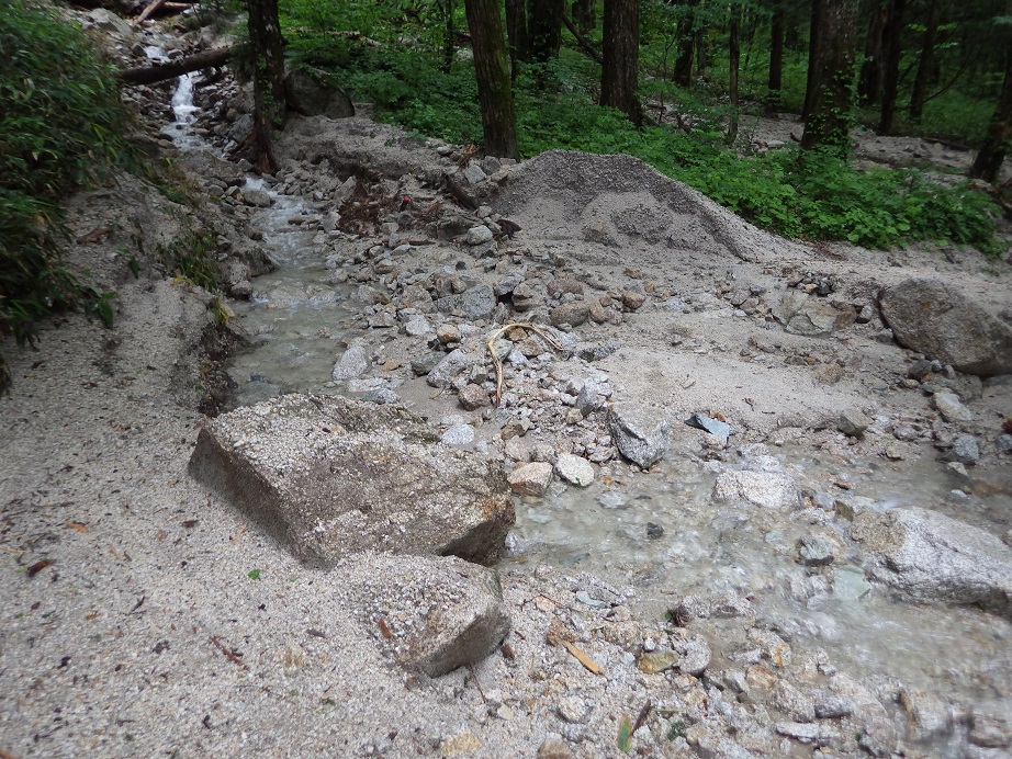 上部の土砂は、地震や雨の影響で現在も非常に不安定な状態です。除去作業も難しく、岳沢湿原~明神間の歩道は通行しないでください。