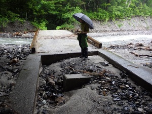 六百沢では土砂が流出していました。 明神付近の白沢に架かる橋の被害