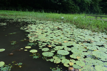 水面に浮いている丸い葉は、「オニバス」というスイレン科の水生植物です。
