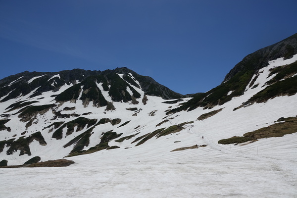 場所は、室堂から一ノ越へ向かう途中の雪渓です。写真で見てかなり傾斜があるのがわかります。
