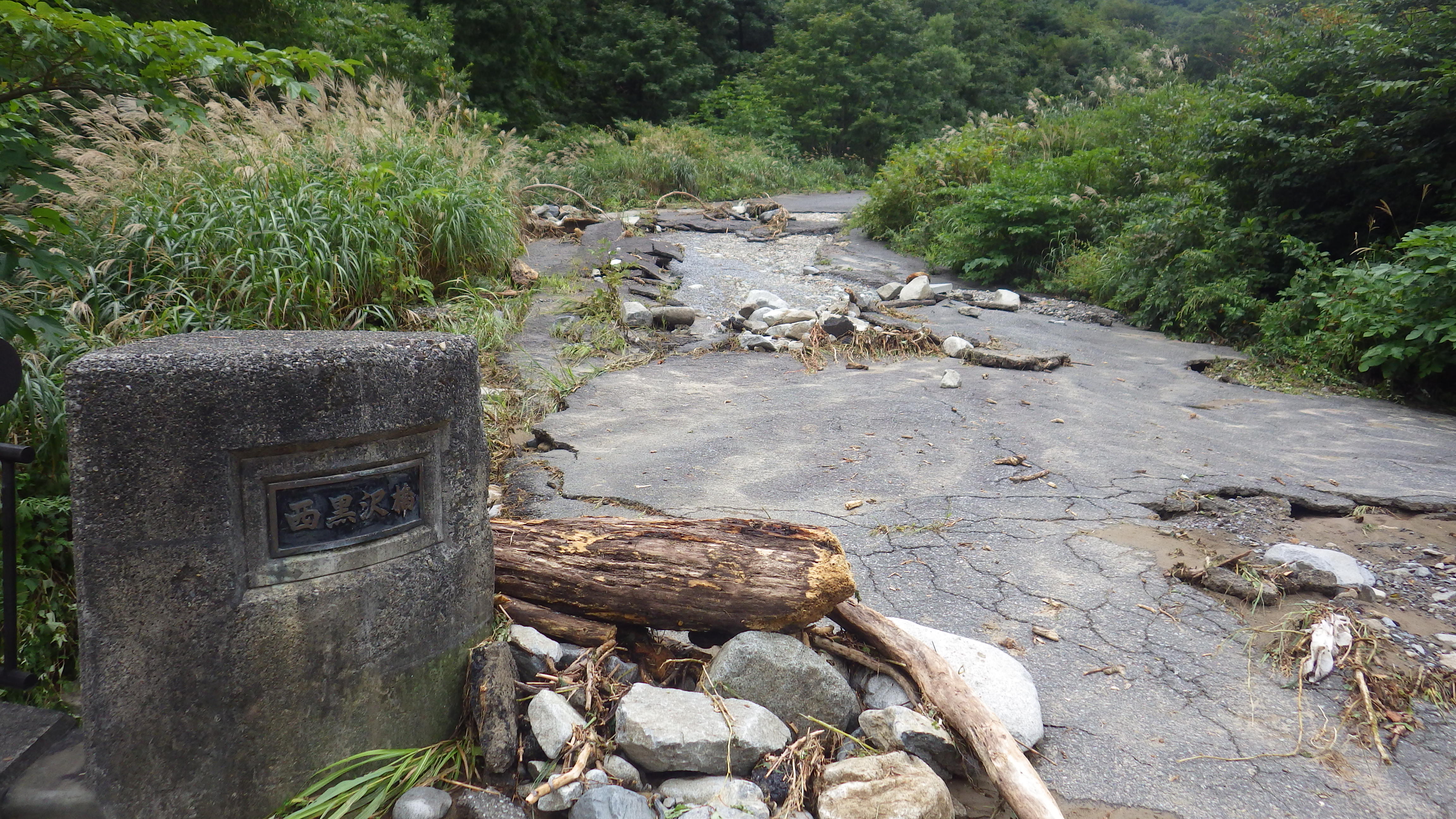 矢印の辺りに橋があるはずですが、土砂に埋もれていました。