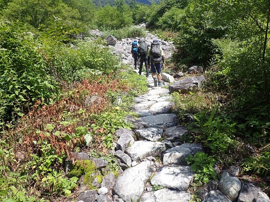 わさび平小屋で小休止して小池新道に入ると整備された登山道で歩きやすく、石の積み