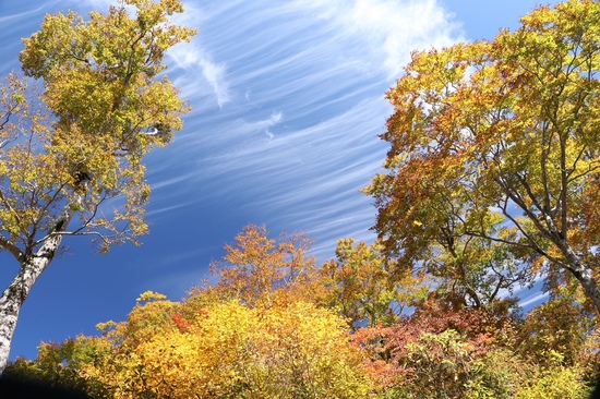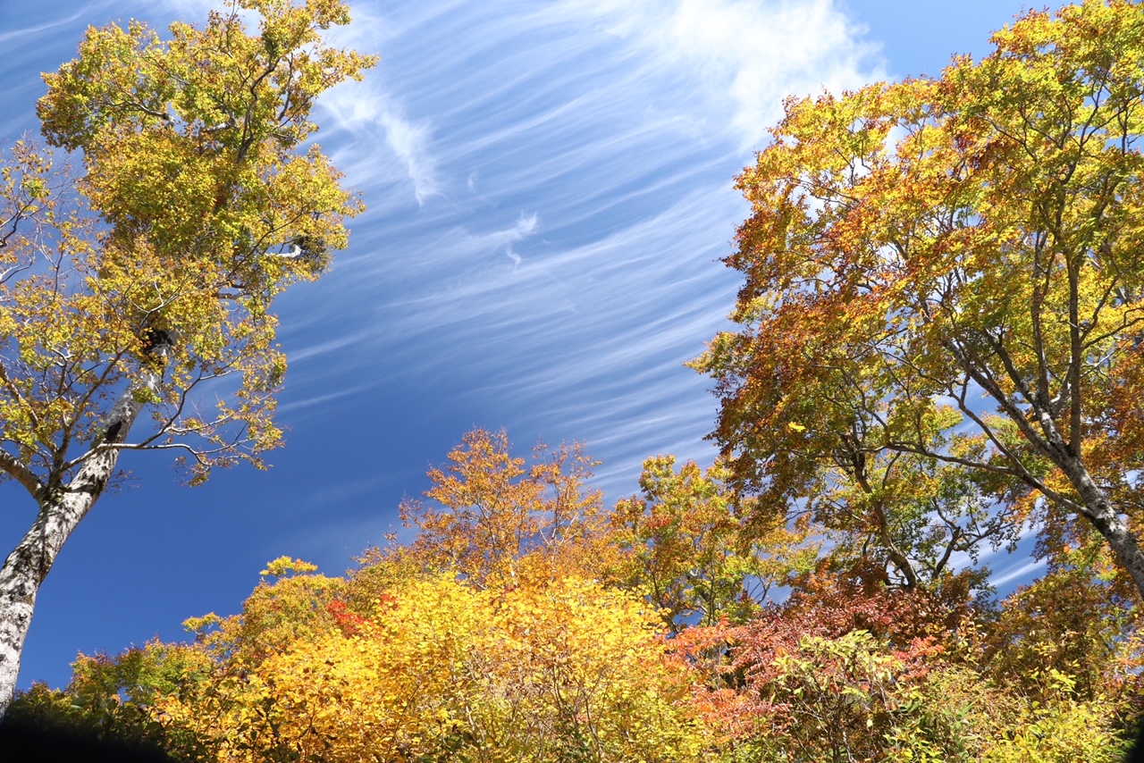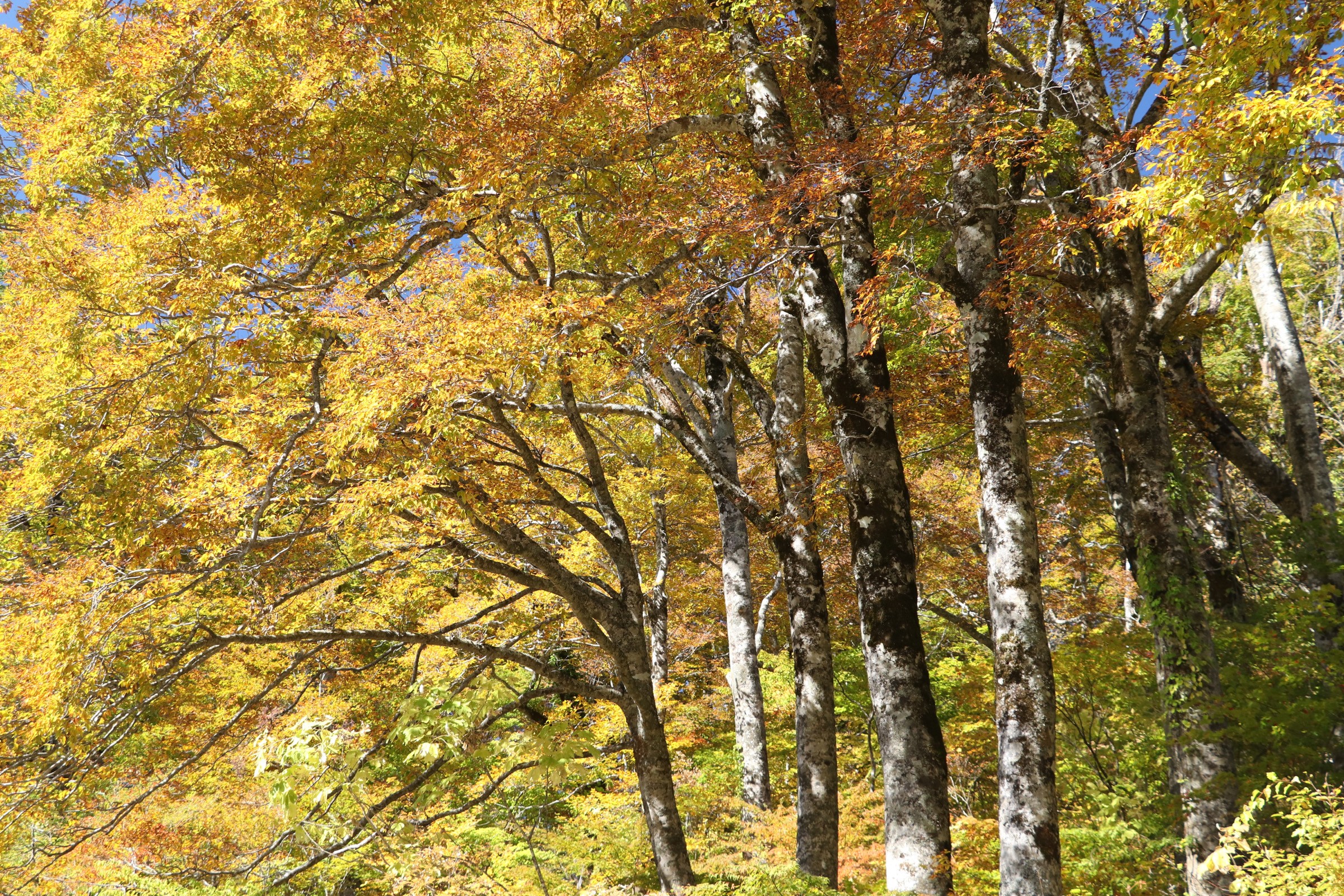 毎年白山を見ている方々に聞くと、今年の紅葉はいまいちなんだそうです。 確かに遠くから山を見たとき、ブナやダケカンバの鮮やかな黄色の印象があまりないような・・・。 ただ、近づいて見ると、秋らしさ満点です!! 日が差し込んだ時は輝いてとてもきれいですし、落ち葉をかさっ、かさっと踏んで歩くのも楽しいです。  (別当出合駐車場近くで撮影 10月21日) 曇りや日が陰ったときには冷え込みますので、紅葉を楽しもうという方は防寒対策をお忘れなく♪