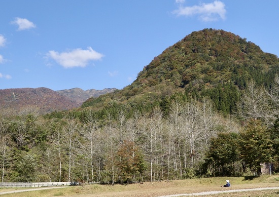 (芝生広場の対岸の斜面には赤く色づいた木々も・・・ 10月21日撮影) ちなみにこちらは白峰地区(標高約500m)から見える山の様子。  (10月21日撮影) 白峰地区の紅葉はまだこれからのようですね。