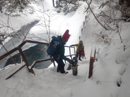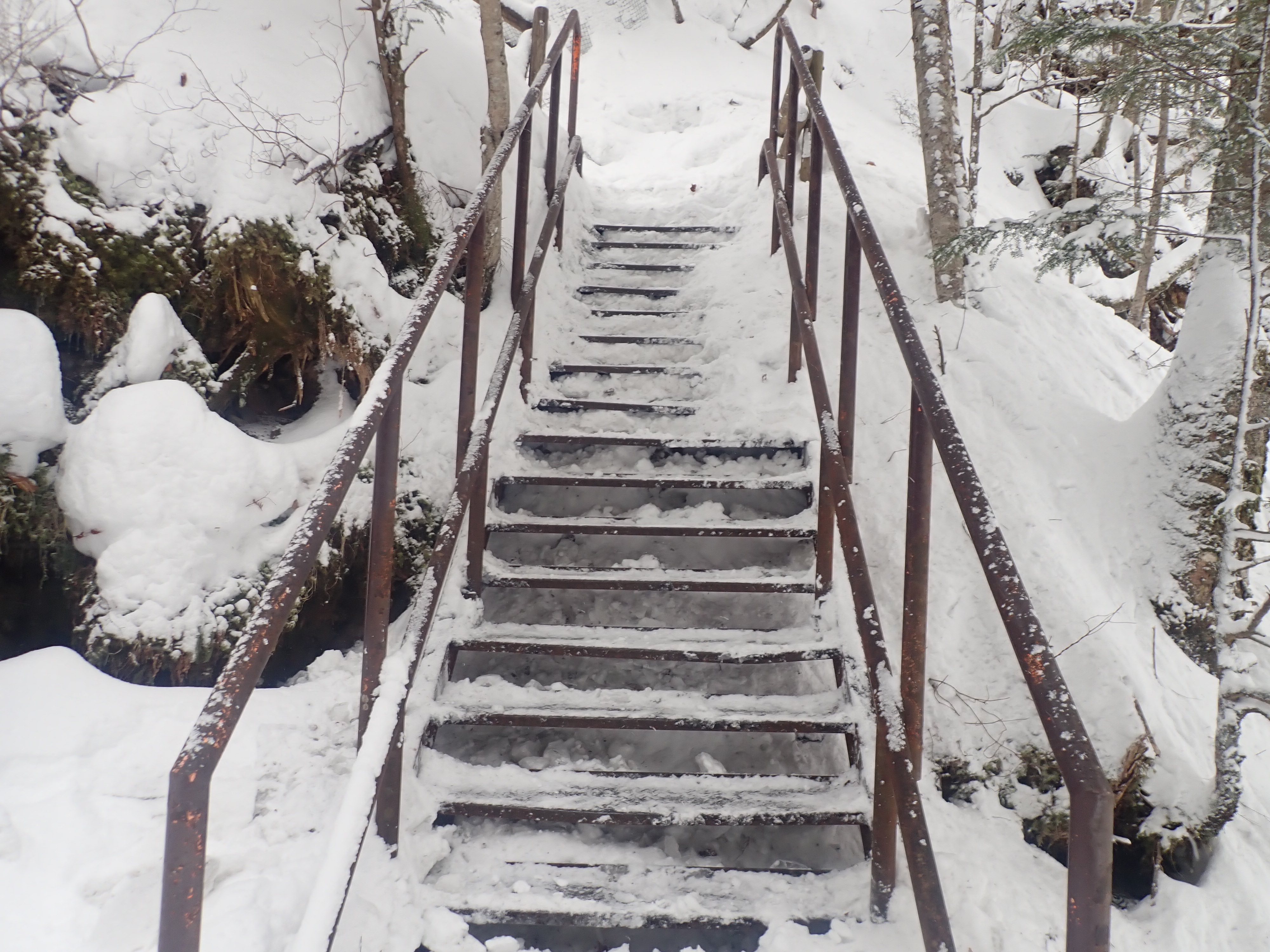 ただ、善五郎の滝周辺は坂道や階段があり、この時期は雪や氷で歩きづらい場合があります。