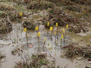 3回目の調査は2月5日(金)。「あたたかくなる」との天気予報だったので、100本の旗を用意し、調査に臨んだところ・・・なんと「172」。今回も予想を大幅に越え、旗作りもしながら調査を続けました。今回、調査範囲の外にある田んぼにも20もの卵塊があったので、ビオトープに避難させ様子をみることにしました。