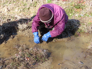 今期の調査は1月21日(木)にスタートしました。調査地区は創造の森横山の「しょうぶ園」「ビオトープ」「めだかの学校」の3地区です。各地区で水温、水位を計測し、その後アカガエルの卵塊の個数を数えます。この日は気温が低く、水たまりには氷が残っている状態でした。水温は約2~7度、水位は約3~10㎝、この日はアカガエルの卵塊を見つけることはできませんでした。しかし、ビオトープの梅が開花していたり、メジロが頻繁に木々を行き来していたりと調査の中で春のきざしを感じる機会となりました。