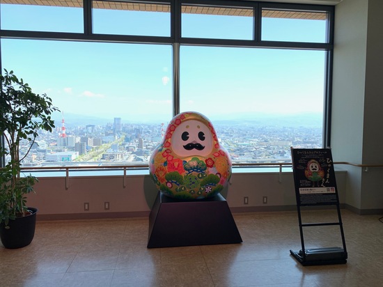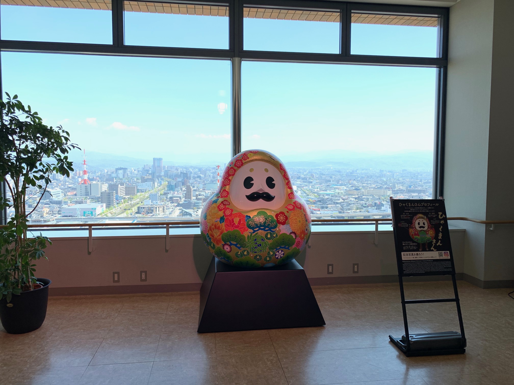 (展望ロビーにいるひゃくまんさん) 展望ロビーからは金沢の街、日本海、そして白山の大パノラマを楽しむことができます。白山はひゃくまんさんがいる側の窓から見えますよ。