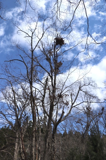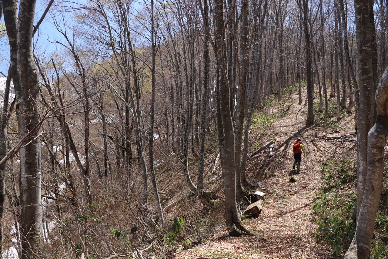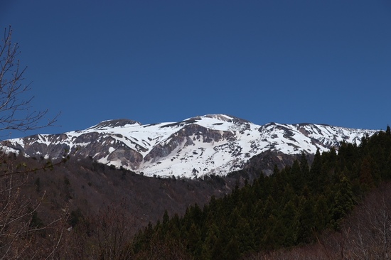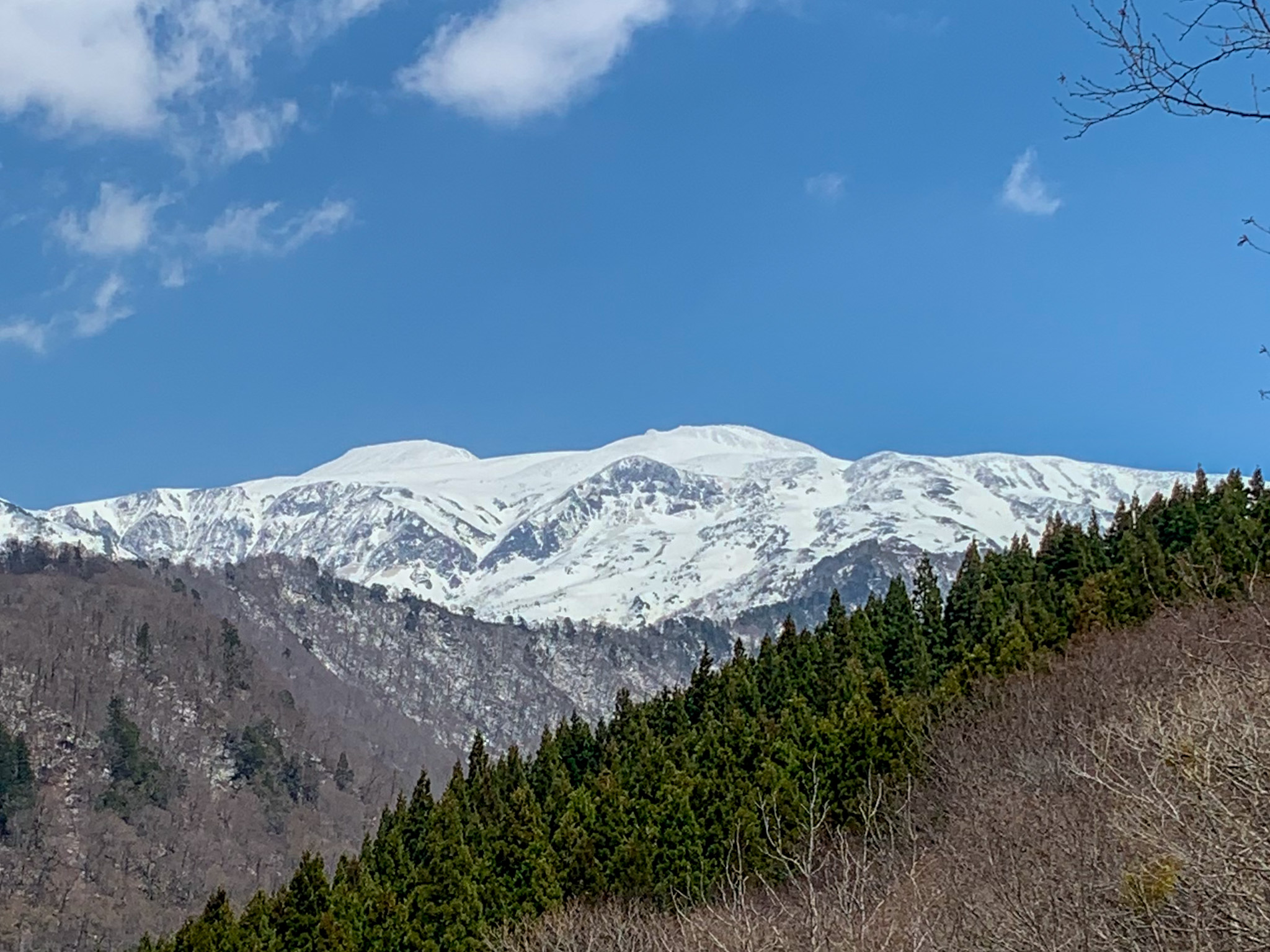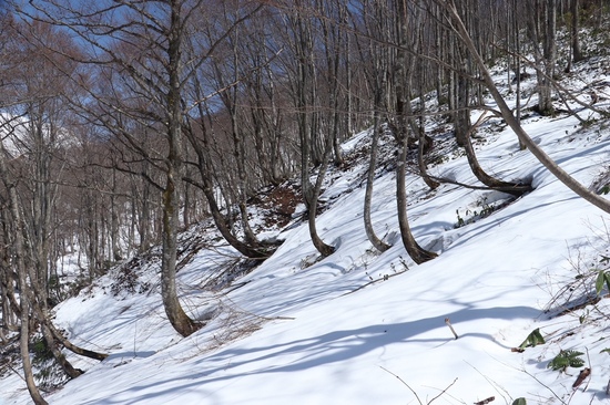 ところで、巡視をしていてつくづく感じたのですが、春は変化が大きい季節ですね。岩屋俣谷園地は雪解けが一気に進みました。  (4月19日のブナ平)  (4月26日のブナ平) 標高1190m付近のブナ平は1週間で雪がなくなりました。 白山の雪もこの通り。  (4月19日の白山)  (4月26日の白山) いずれも標高985mの白山展望台から撮影しました。 白山はさすがにまだまだ雪山ですが、黒いところが増えました。季節が進んでいるのがわかります。 そして、巡視の時、木々が葉を広げる前だからこそ楽しめるものにたくさん出会いました。 <その1:曲がった木> 葉が茂っていない季節、森の中は見通しがききます。 そこで私が気になるのは木の根元。 白山周辺の山々では斜面の木々の根元が曲がってるんですよ。  (みんなそろって曲がってる。4月19日撮影) 私が育った関西ではこんな木を見た記憶がありません。 実はこれ、豪雪の影響なんだそうです。 詳しくはいつか改めてご紹介したいと思います。 雪の少ない地域の皆さん、白山にお越しの際は、ぜひ木の形にもご注目ください! <その2:クマ棚> 上を見上げると、木の高いところに枯れ枝が集まっていることがあります。