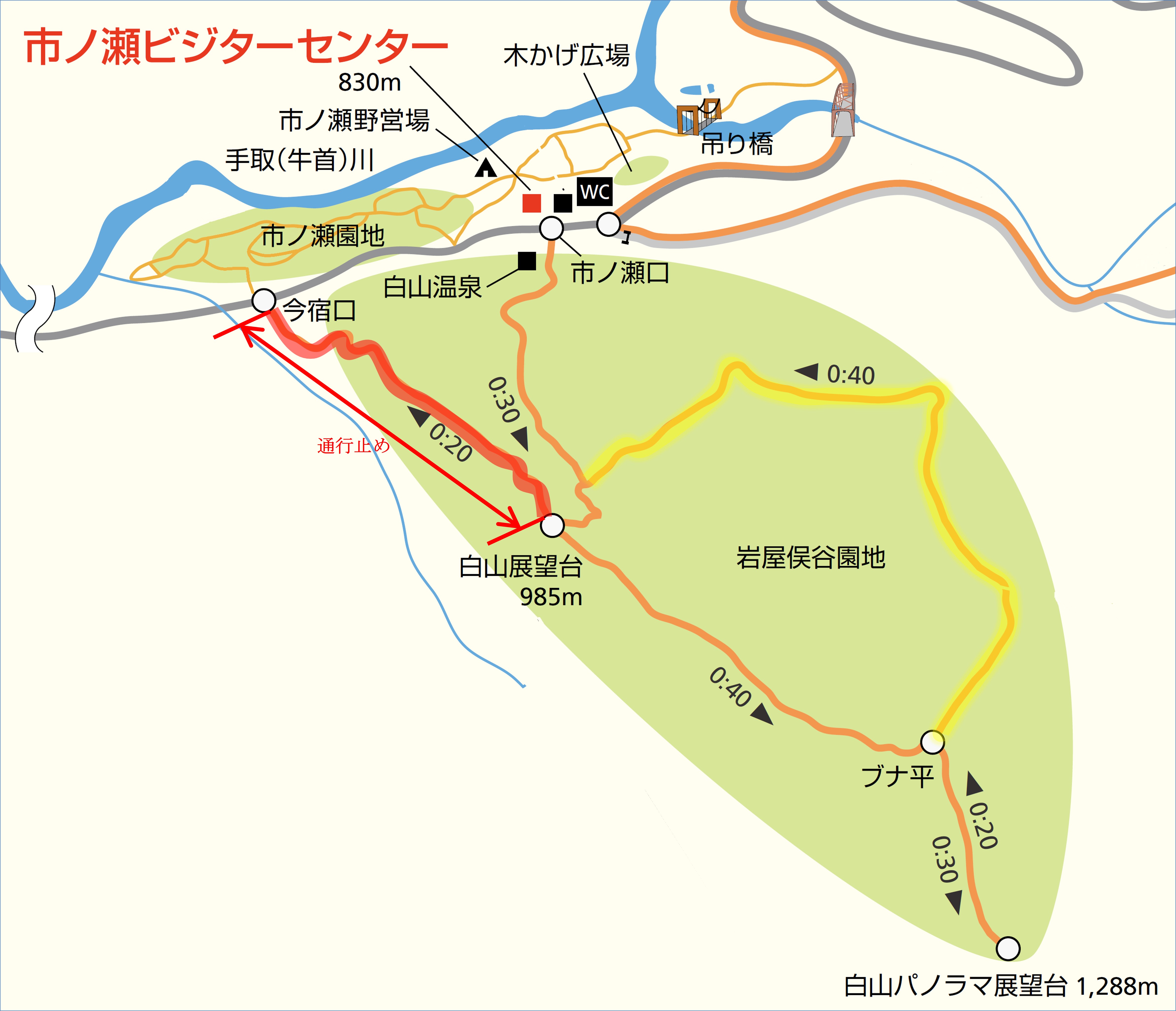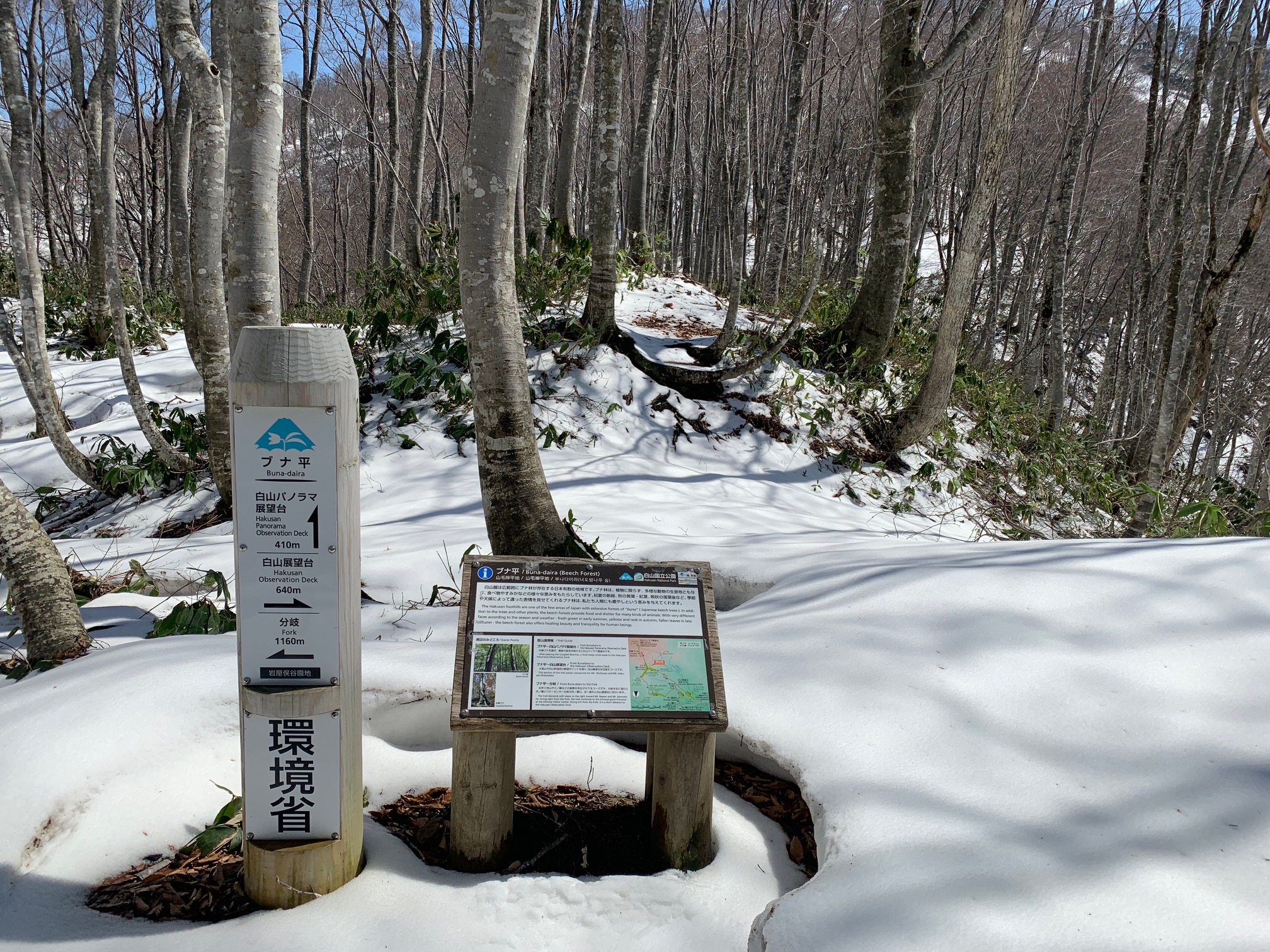 (市ノ瀬地区で咲く春の花、キクザキイチゲ。4月26日撮影) 通行止めが解除される少し前、私たちは道路管理者の許可を得て、市ノ瀬地区で環境省が管理している施設や園地の安全確認に行ってきました。 冬の間に、雪の重みで木が倒れたり、木道が傷んだりすることがあります。 木の場合、完全に倒れきっていればまだいいのですが、時々、倒れそうだけど何とか立っているような木があります。このような木は、あるとき突然倒れてくることがあり、とても危険です。 このため、私たちは登山道沿いに危険な木や危ない場所がないか、巡視で確認をしています。  (実際に歩いて安全を確認していきます。4月26日) 岩屋俣谷園地では、巡視の結果、市ノ瀬口から登るコースについては、すぐに倒れる恐れのある木はないことが確認されました。2019年から通行止めの原因になっていた倒れかけの大きな木は昨年除去したため、市ノ瀬口からブナ平を周回するコースはこの春から通れるようになりました! なお、今宿口から白山展望台までの区間は、倒れそうな枯死木があること、階段が破損して通行が危険な箇所があることから、引き続き通行止めにしています。皆さまにはご迷惑・ご不便をおかけし、申し訳ありませんが、通行が可能になるまでお待ちください。  (岩屋俣谷園地と市ノ瀬周辺の地図) 赤色線で示した箇所は現在も通行止めの区間で、黄色線で示した箇所はこの春、通行止めを解除した区間です。