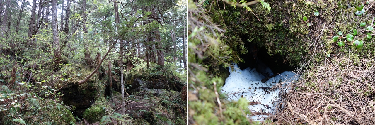 右:重なった溶岩の隙間から出てくる風は冷たく感じます。そのような隙間に雪が残っていることがあります。