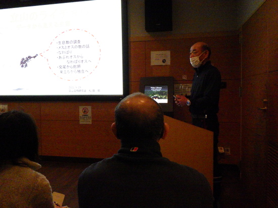 講演されたのは富山雷鳥研究会の松田勉さんです。松田さんは富山県が5年に一度行っているライチョウ調査の中心メンバーとして活動され、立山のライチョウについて長年研究されてきた方です。