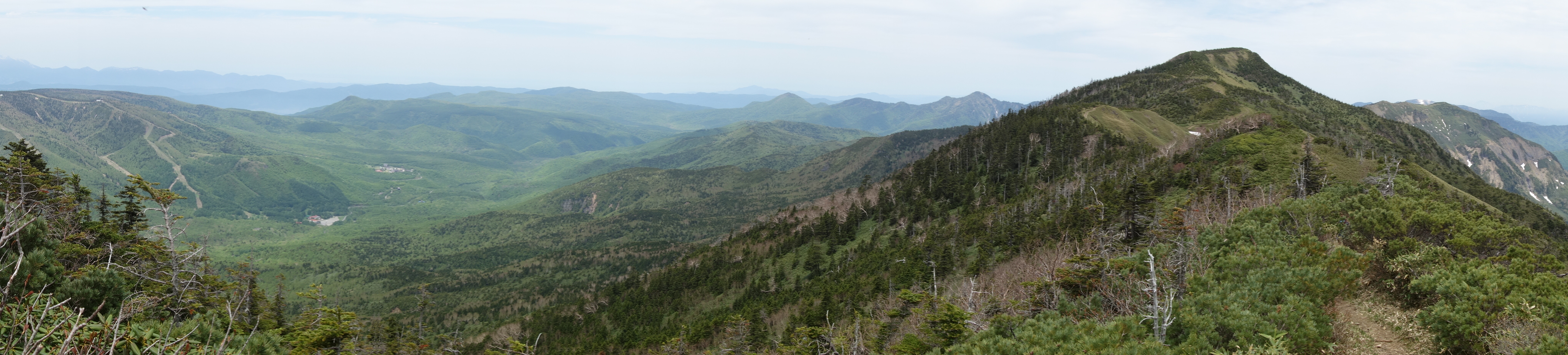 岩菅山山頂から北方向を撮影。右手前が裏岩菅山。裏岩菅山の左奥が鳥甲山。右奥に苗場山の山頂部がわずかに覗く。左端は焼額山。